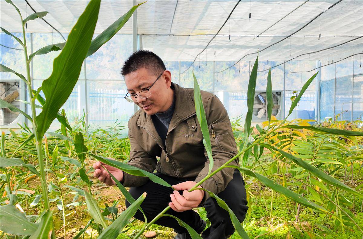陈风雷在温室大棚内查看阳荷植株生长情况。(湖北日报全媒记者 赵怡然摄)