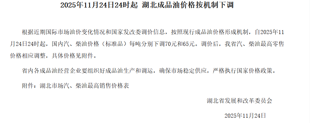 省发改委价格管理处介绍,根据近期国际市场油价变化情况和国家发改委调价信息,按照现行成品油价格形成机制,自2025年11月24日24时起,国内汽、柴油价格(标准品)每吨分别下调70元和65元。调价后,我省汽、柴油最高零售价格相应调整,92号、95号汽油分别降至每升6.89元、7.38元,0号柴油降至每升6.51元。