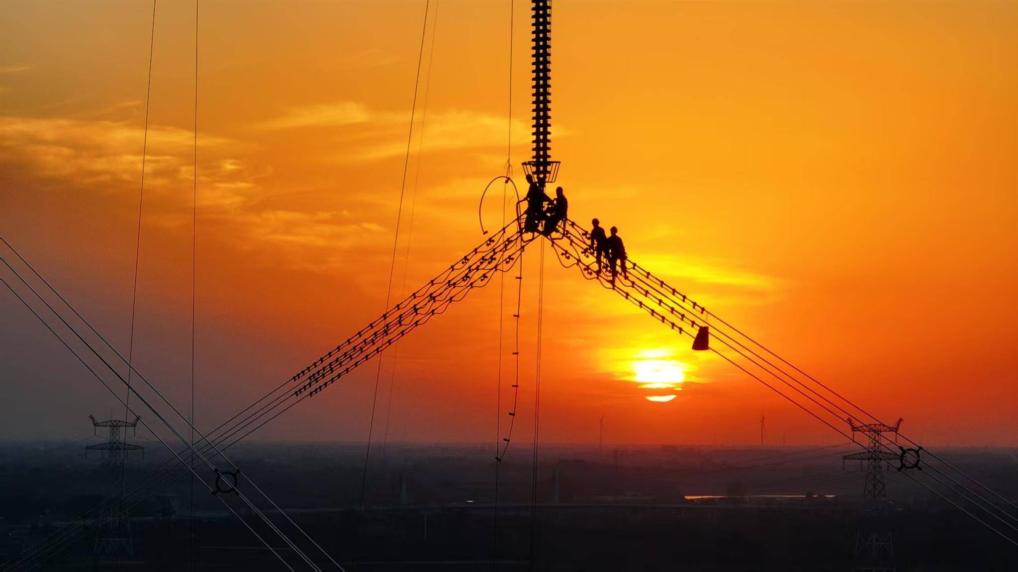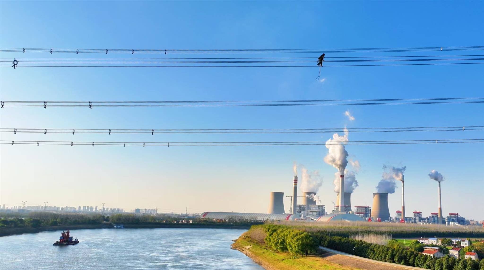 11月18日,电力作业人员对汉川电厂四期送出工程——汉川电厂至500千伏军山变电站线路跨越汉江区段进行竣工质检验收,犹如高空走钢丝。(孔韬 摄)