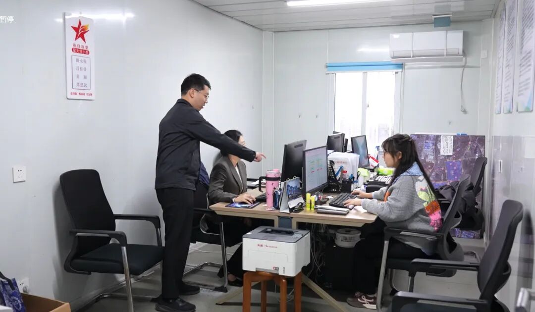 楚能新能源宜昌80GWh全新一代锂电池项目协调服务机制办公室所在的板房内,工作人员正在查看项目进度。
