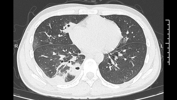 熬到第三天,小林已经烧到39℃,赶紧去医院就诊。接诊的主任医师丁群力一看他的症状,立刻安排了CT检查。结果显示:小林的肺里有十几个空洞,部分肺组织已经坏死,这是典型的血源性肺脓肿。