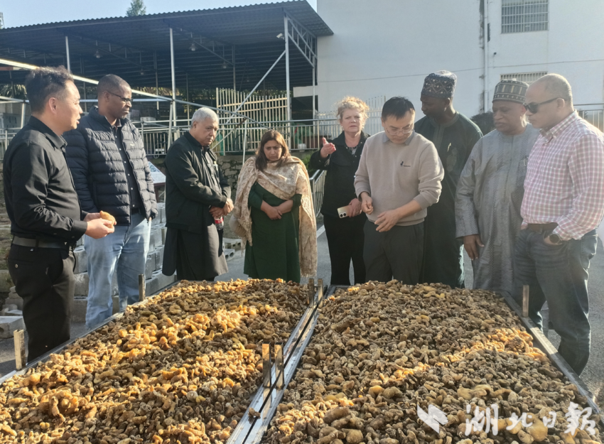 当日上午,专家们首站来到位于白霓镇谭家村的湖北黄精哥食品有限公司,实地观摩黄精产品从种植到加工的全链条流程。大家深入生产车间、样品展厅与种植基地,通过现场观摩、听取介绍和互动交流,全面了解了黄精的种苗繁育、精深加工及市场开拓情况。专家们对黄精的独特功效表现出浓厚兴趣,一致表示将积极向本国推介崇阳黄精,助力这一地方特色产品走向国际舞台。
