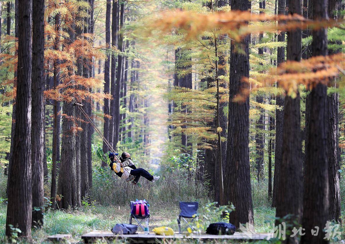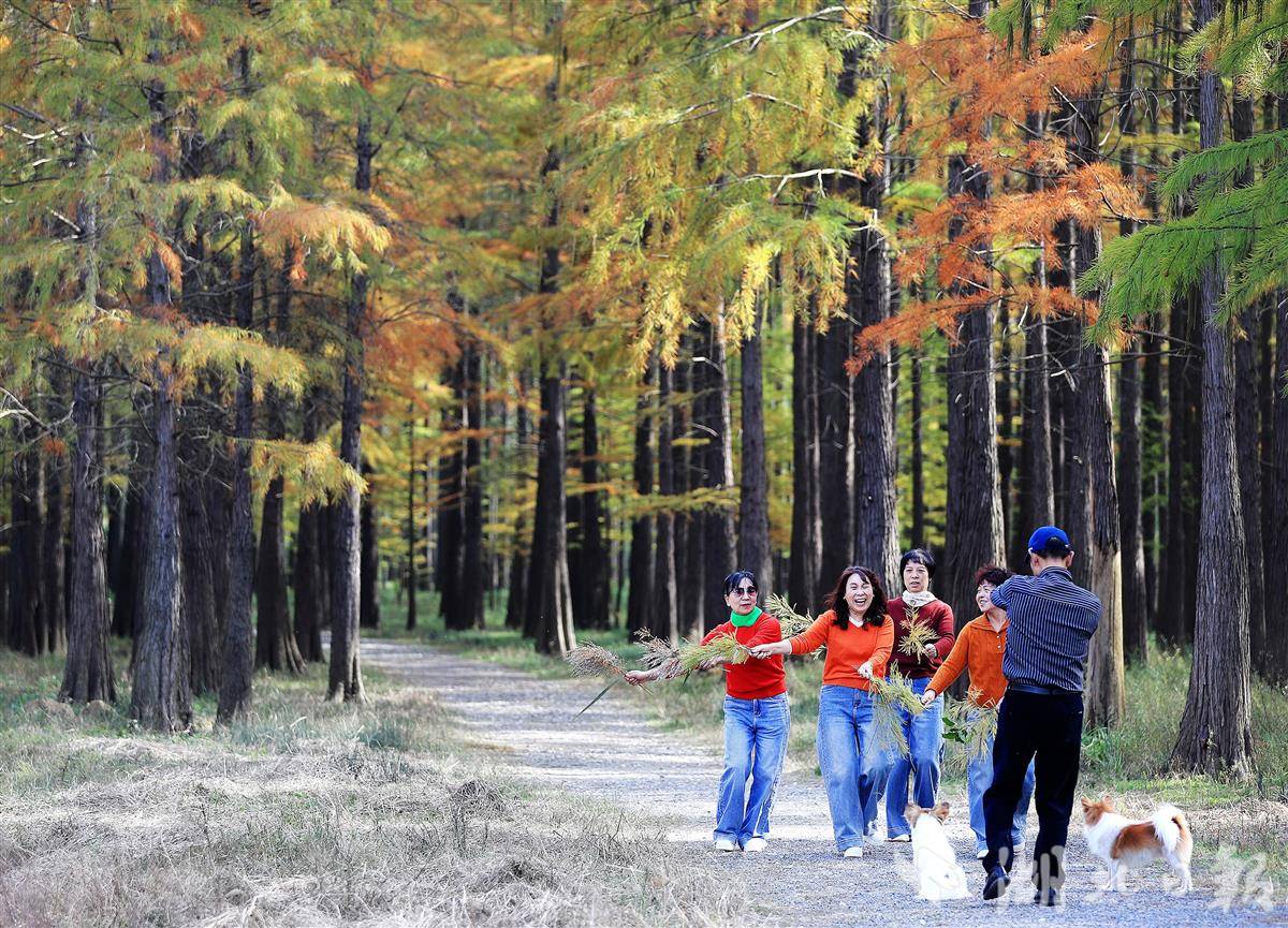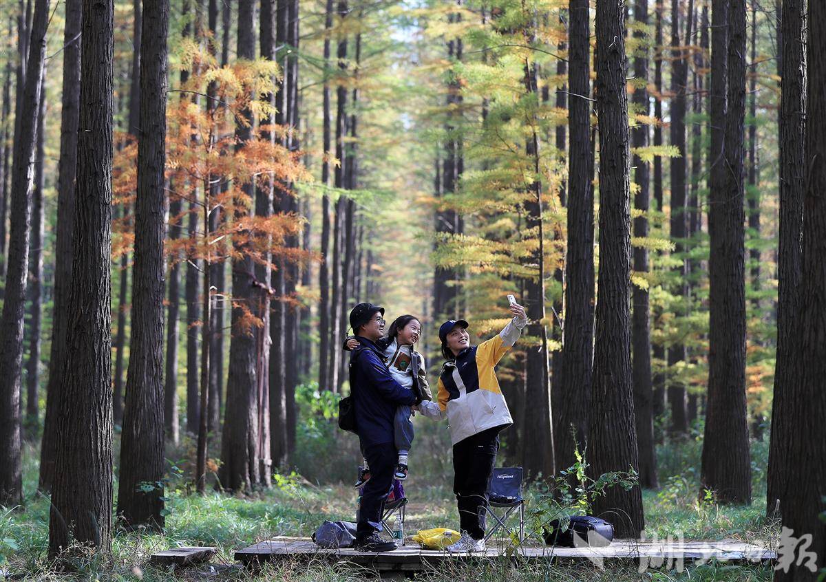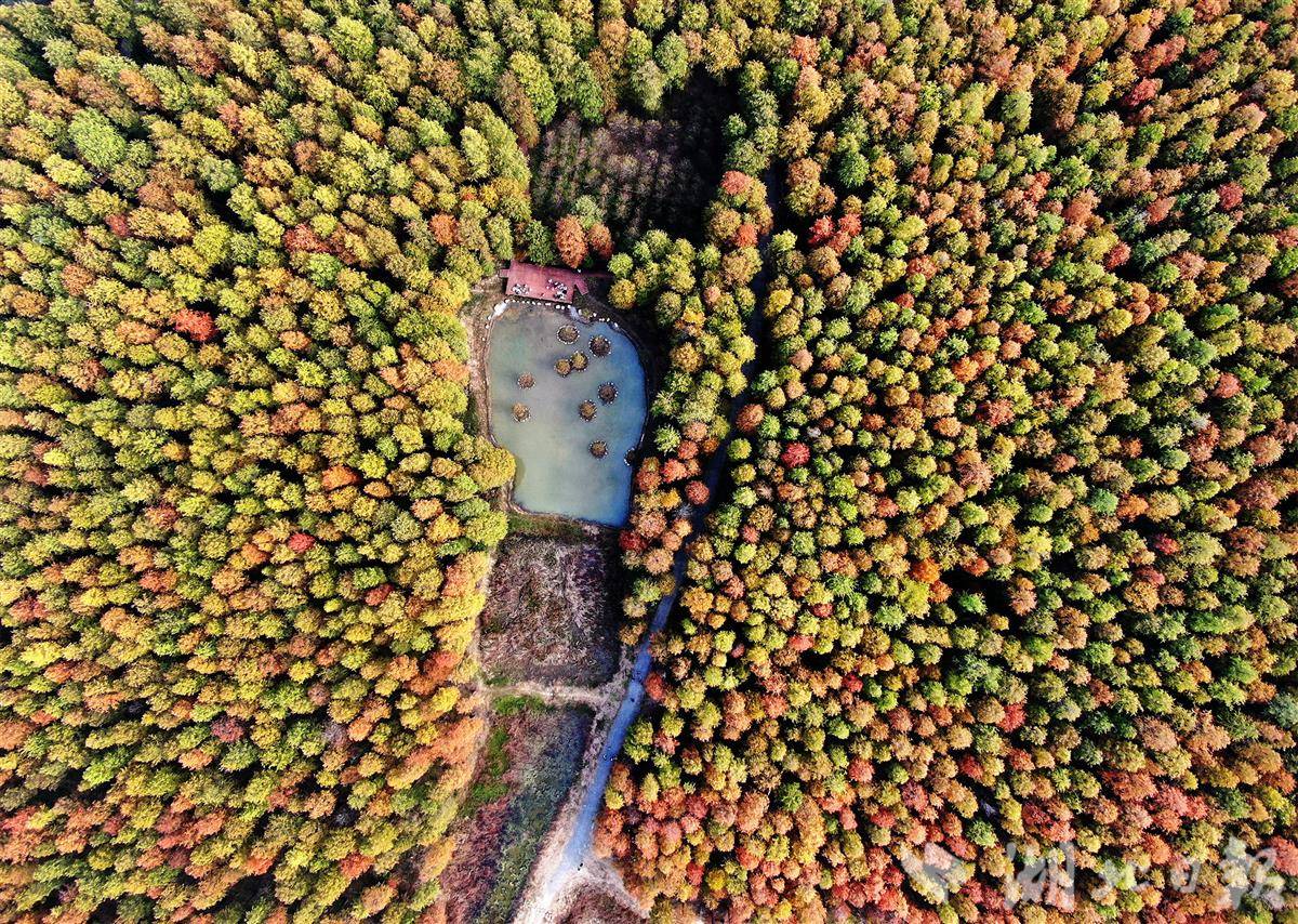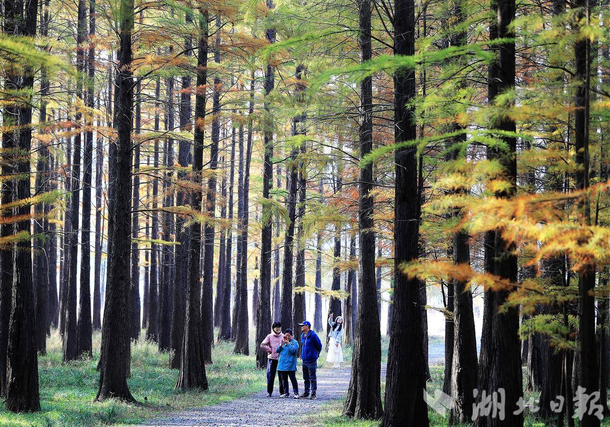11月22日,游客在太子山国家森林公园游玩。初冬时节,京山市太子山国家森林公园迎来红杉林最佳观赏期。暖阳映照下,百亩林海层林尽染,五彩斑斓的枝叶交织,宛若一幅巨型油画。游客漫步在蜿蜒栈道,沉醉于“人在画中游”的诗意长卷。
