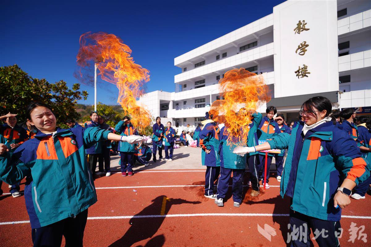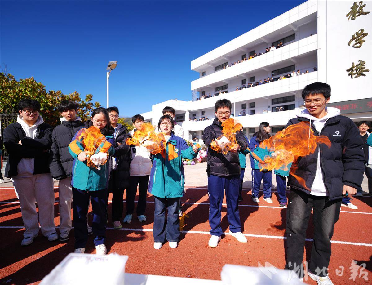11月25日,巴东县第三高级中学校园内,学生们正体验趣味掌中火焰试验,探索科学奥秘。