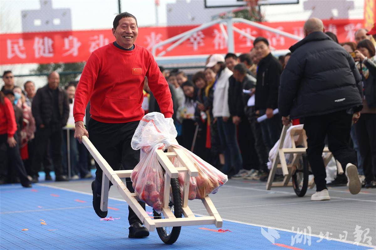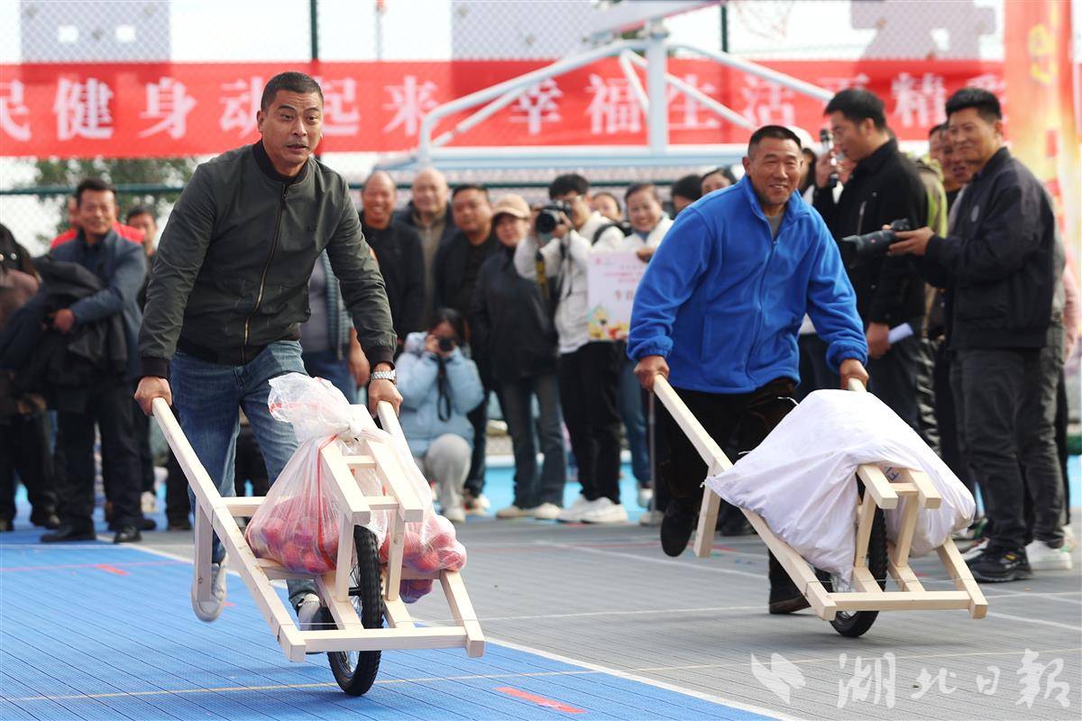 11月22日,襄阳市太平店镇李家湾村,2025年襄阳市“农民丰收节”全民健身主题活动暨农民健身趣味运动会在村文体广场开幕。活动设置“五谷满仓”挑粮赛、“车载丰年”推车赛、丰收投壶、“沃土争锋”田间拔河等农趣项目,来自樊城区的15支代表队同场竞技,在运动中展现新时代农民风采,共享丰收喜悦,助力乡村振兴。(视界网 王虎 摄)