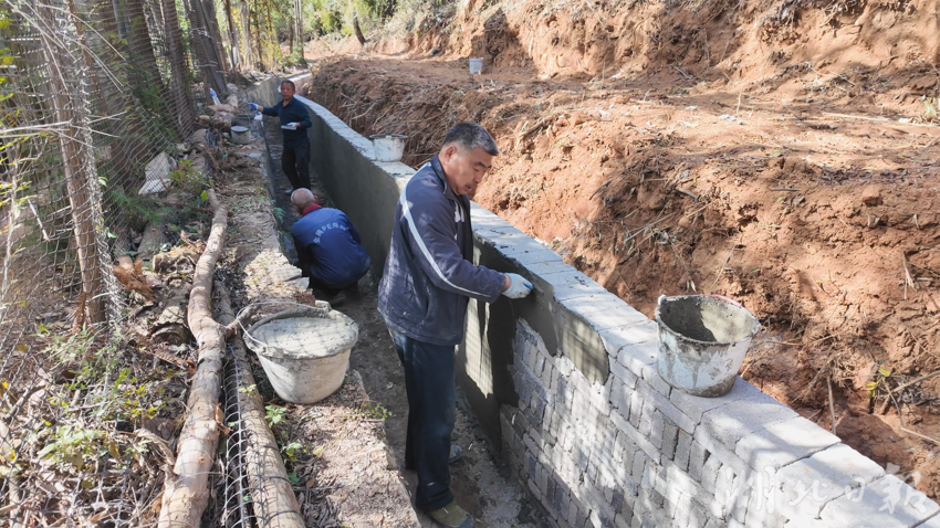 11月25日,青山镇石铺村苦菜冲水渠施工现场,工人们挑运水泥、砌筑渠壁,铲车往来穿梭运送建材,到处是一派热火朝天的繁忙景象。