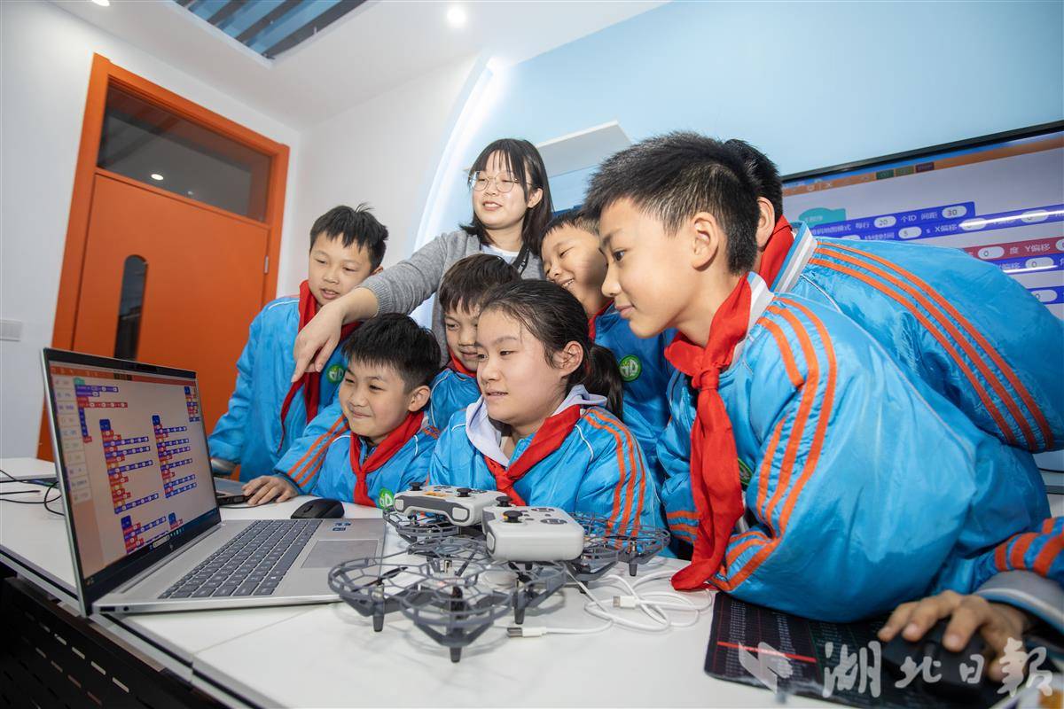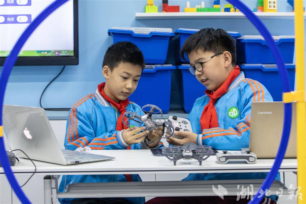 11月25日,在襄阳市大庆路小学,学生们在学习无人机编程。