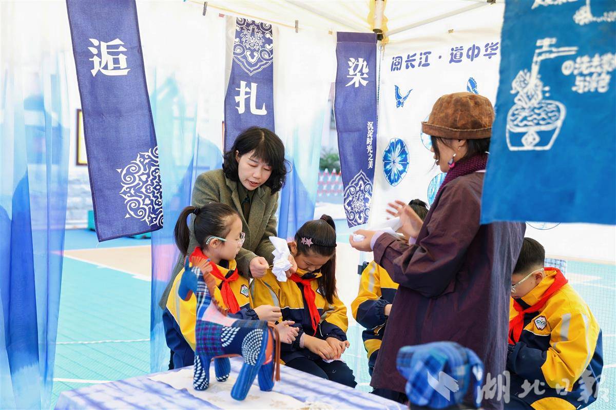 校园一隅,“土家竹编”“非遗扎染”“西兰卡普”等特色活动课程展示区热闹非凡,嘉宾们纷纷驻足,时不时与忙碌中的老师和孩子们进行交流。