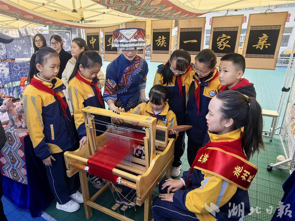 恩施民族小学的孩子们正在体验西兰卡普编织特色课程。