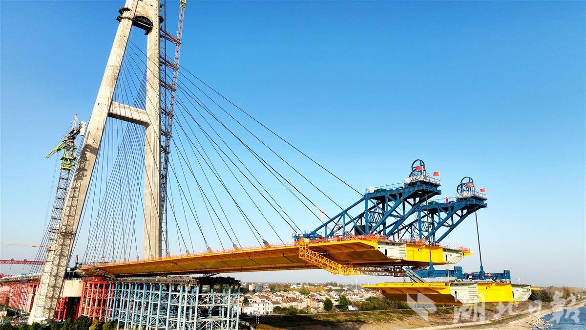 11月25日,枝江长江大桥施工现场正在进行钢箱梁吊装作业,标志着大桥建设已按计划全面转入上部结构施工阶段,整体施工有序推进。枝江长江大桥是当枝松高速公路的控制性工程,是当前世界跨径最大的钢-UHPC组合梁斜拉桥。大桥采用A型桥塔,北塔高242.5米,南塔高257米。桥面全长1549米,主跨890米,双向六车道设计。大桥预计将于2026年建成通车。(视界网 刘卫东 摄)