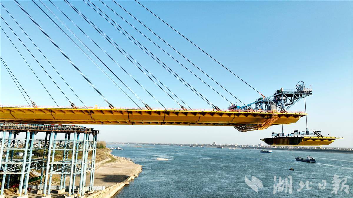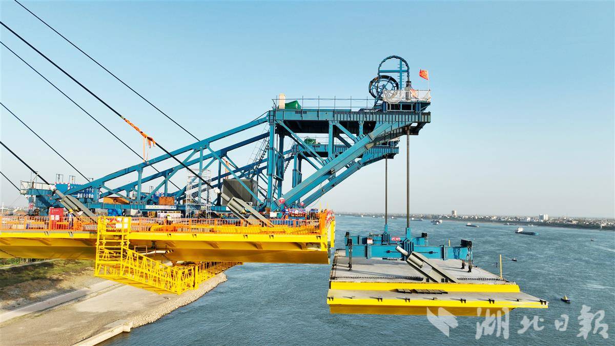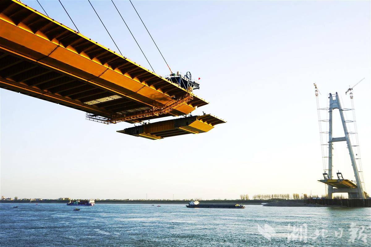 11月25日,枝江长江大桥施工现场正在进行钢箱梁吊装作业。