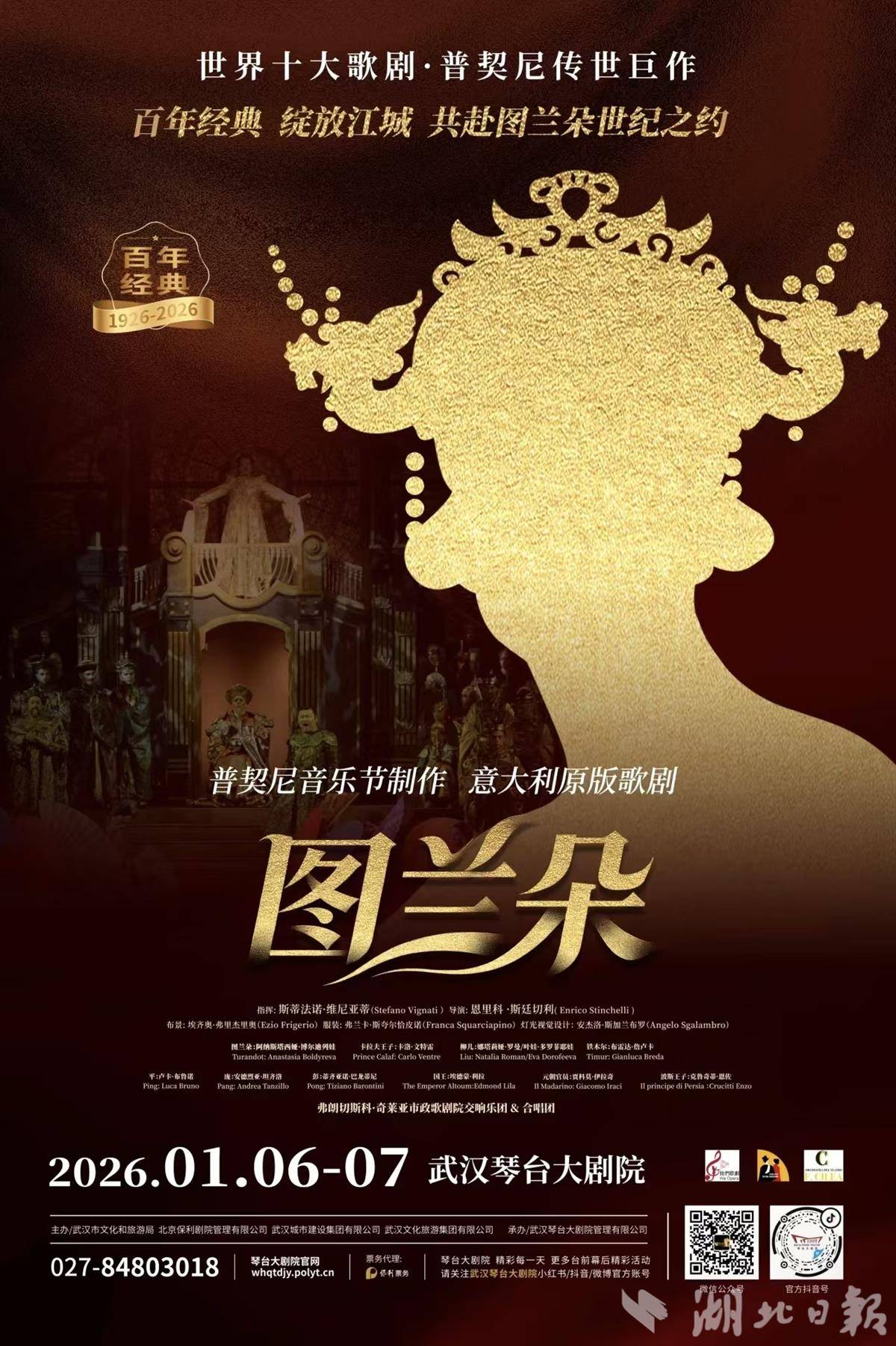 湖北日报讯(记者农新瑜、通讯员周媛媛)新年首场大戏,迎来世界百年经典。11月26日,武汉琴台大剧院发布官方信息,意大利歌剧大师普契尼的巅峰之作《图兰朵》及系列音乐会,将于2026年1月4日至7日登陆武汉琴台大剧院、琴台音乐厅。这将是这部风靡全球近百年的经典歌剧首次亮相江城。