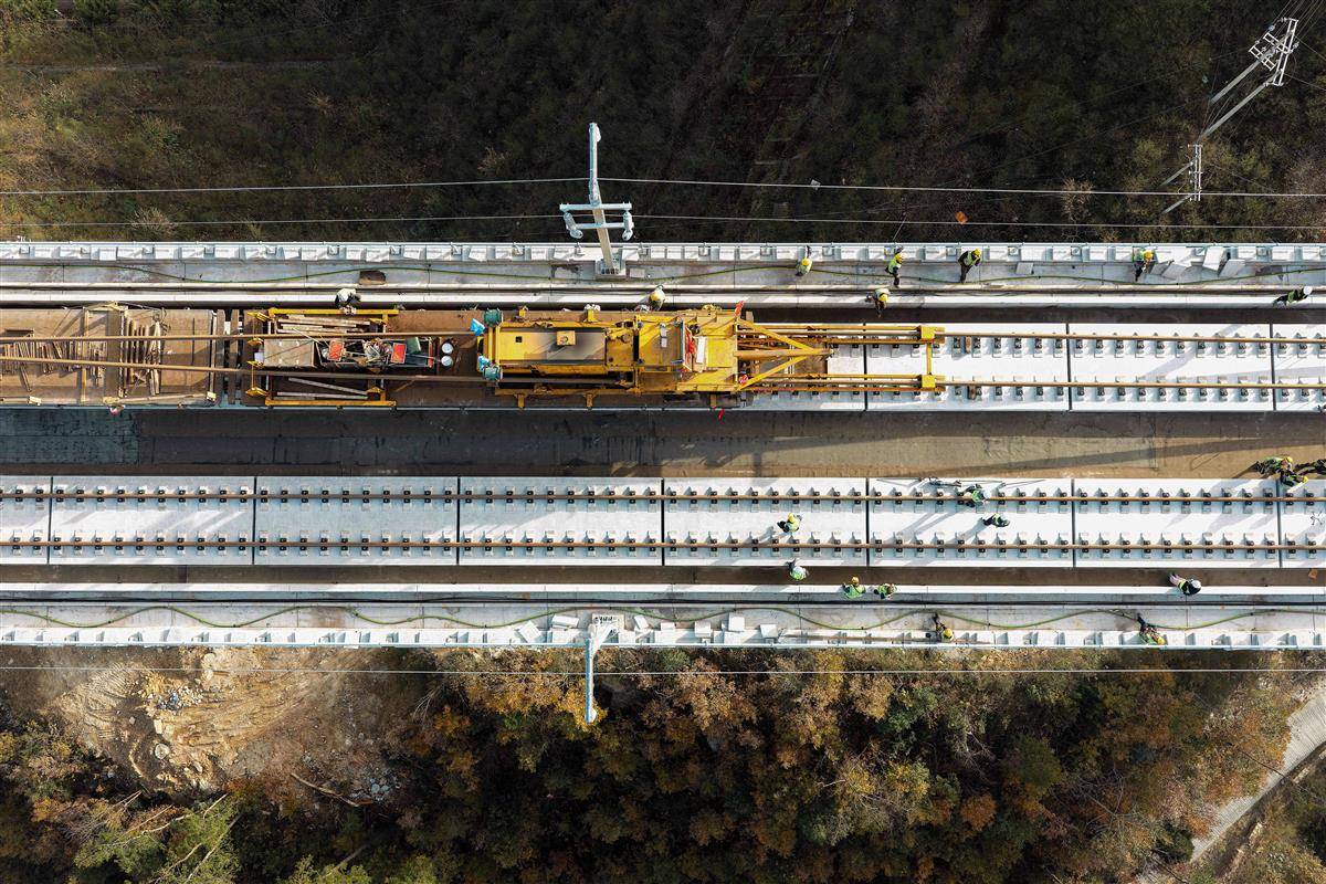 此次铺轨贯通点神定河大桥,全长841.05米,桥墩最高达108米,是全线墩高最高的大跨度连续结构特大桥。该桥紧邻十堰东高铁站,一边衔接汉十高铁,另一边连接在建的西十高铁,是线路控制性工程之一。