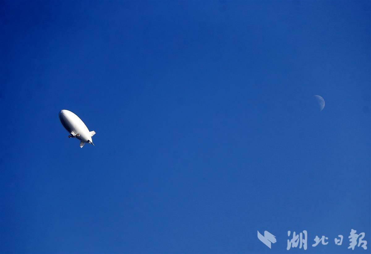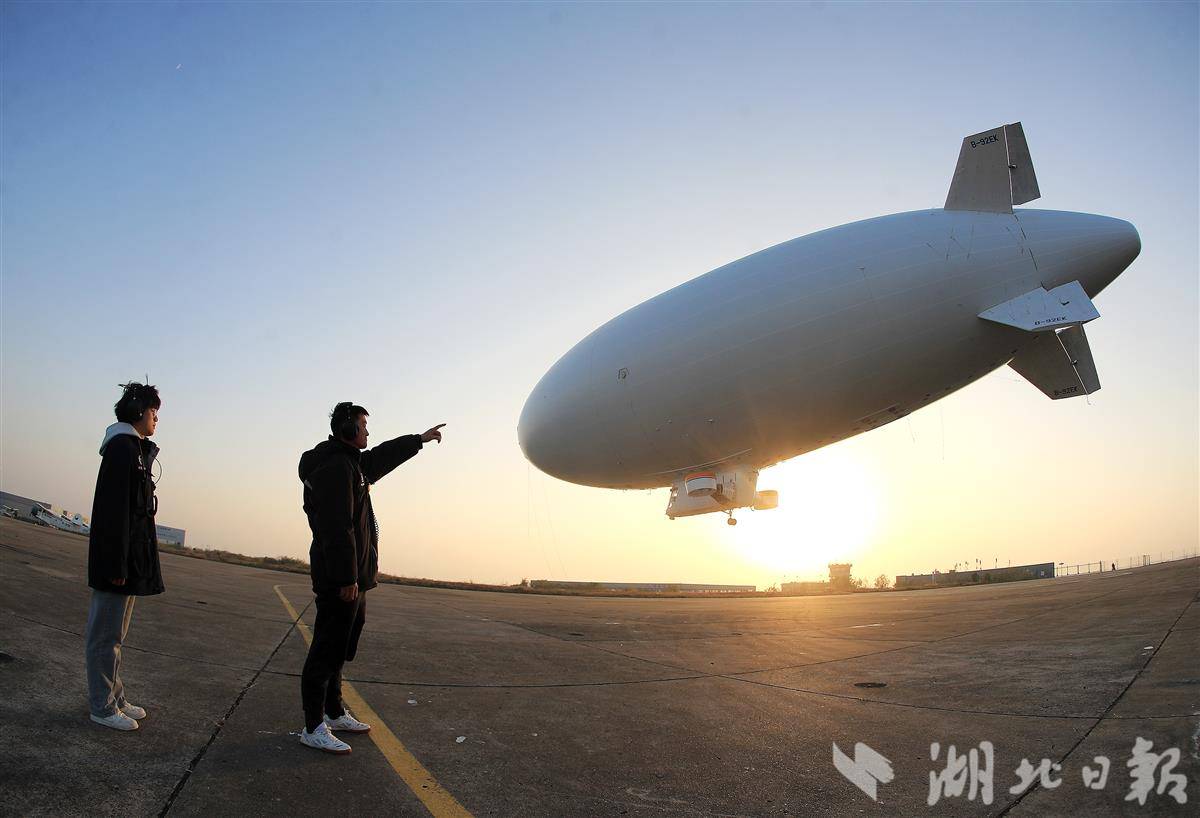 11月27日,国产“祥云”AS700载人飞艇在荆门市漳河机场开展驾驶员转场飞行训练,为飞艇投入商业运营做准备。
