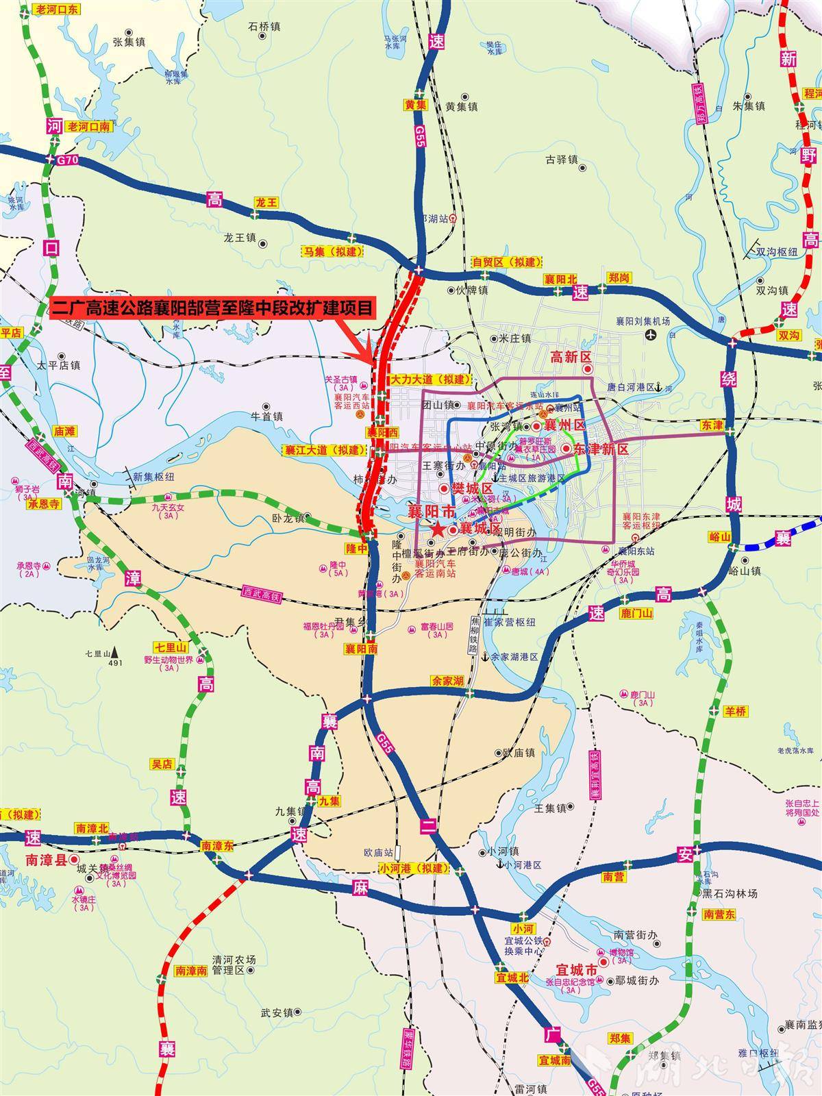 同日启动的二广高速公路襄阳郜营枢纽至隆中互通段改扩建项目,全长23公里,总投资41亿元。该路段起于襄州郜营枢纽,止于襄城隆中互通,将按双向八车道、时速120公里的高标准建设,并改扩建3处互通,新建樊城互通。