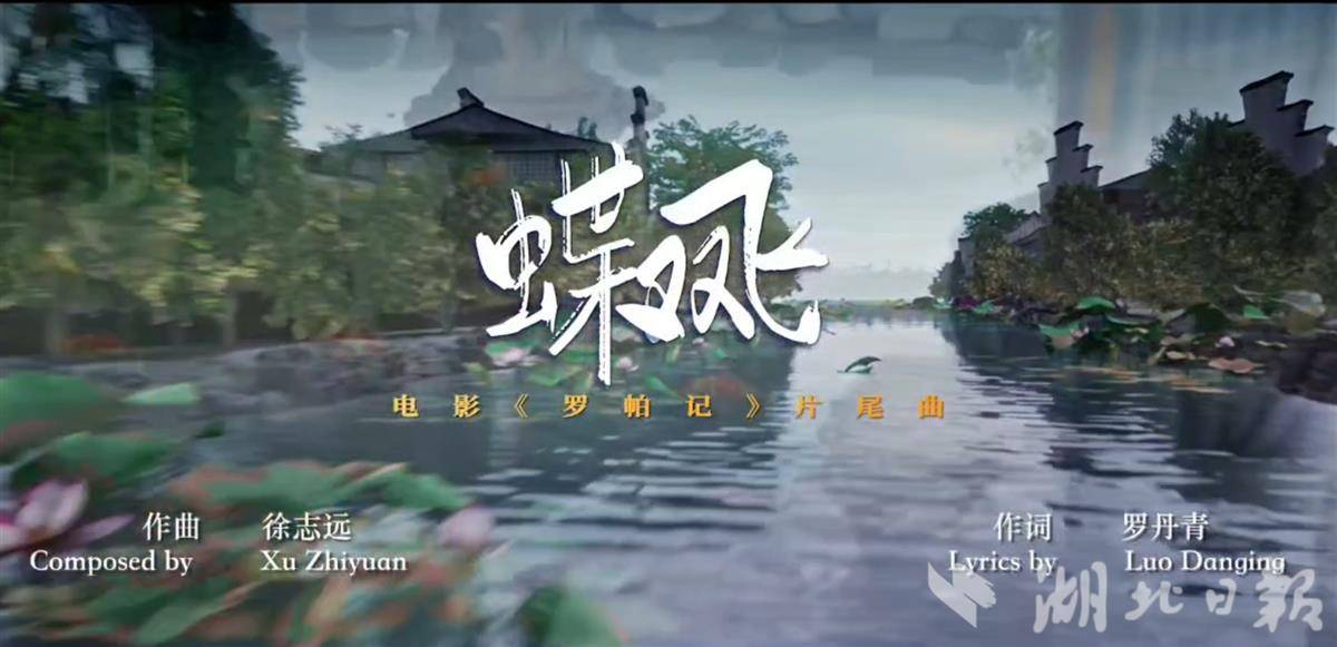 原来,在拍摄结尾时,有两只蝴蝶意外闯入镜头,围绕主演翩翩起舞。更为神奇的是,在后期审片过程中,两只蝴蝶再次不请自来,飞进了审片棚内。这接连两次的“蝶缘”,让导演马崇杰灵光闪现,一拍大腿激动地说:“我们主题曲就叫《蝶双飞》!”围绕这一主题,经词作者罗丹青作词、作曲家徐志远谱曲,一首意境悠远、巧妙糅合了戏韵与歌情的主题曲应运而生:“蝶双飞,梦相随 / 十里红妆,惹得痴情人儿醉/ 弱水三千只为这一杯 / 蝶双飞,花溅泪 / 十里春风熏得离人心儿 / 难抵沧海,此生也无悔……”