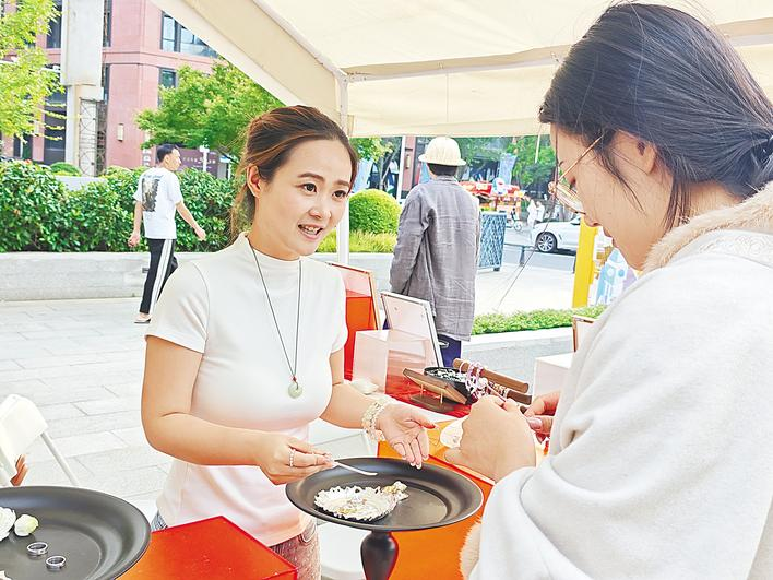 池汝瑶在青春市集上给顾客介绍自己设计的珠宝产品。(湖北日报全媒记者 冯袁玥 摄)