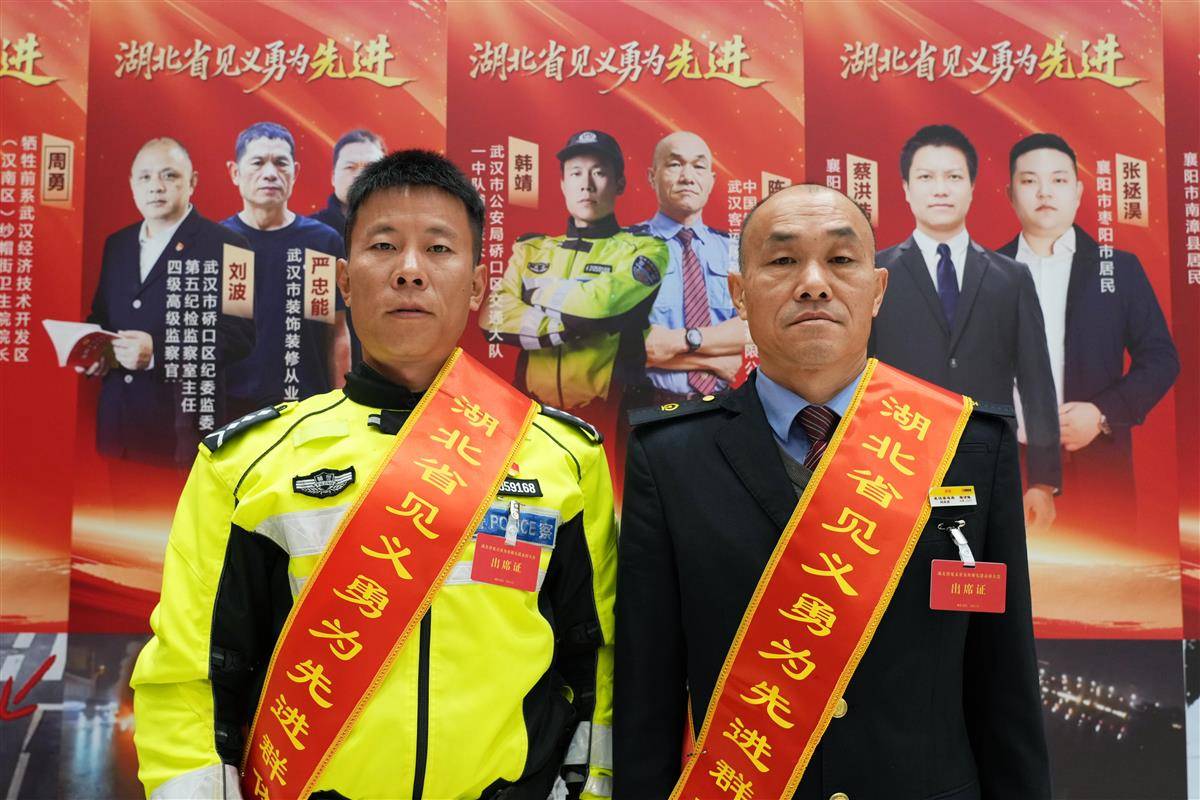 退役军人、武汉市公安局硚口区交通大队一中队辅警班长韩靖(左) 中国铁路武汉局集团有限公司武汉客运段列车员、长江救援志愿队队员陈才斌(右)