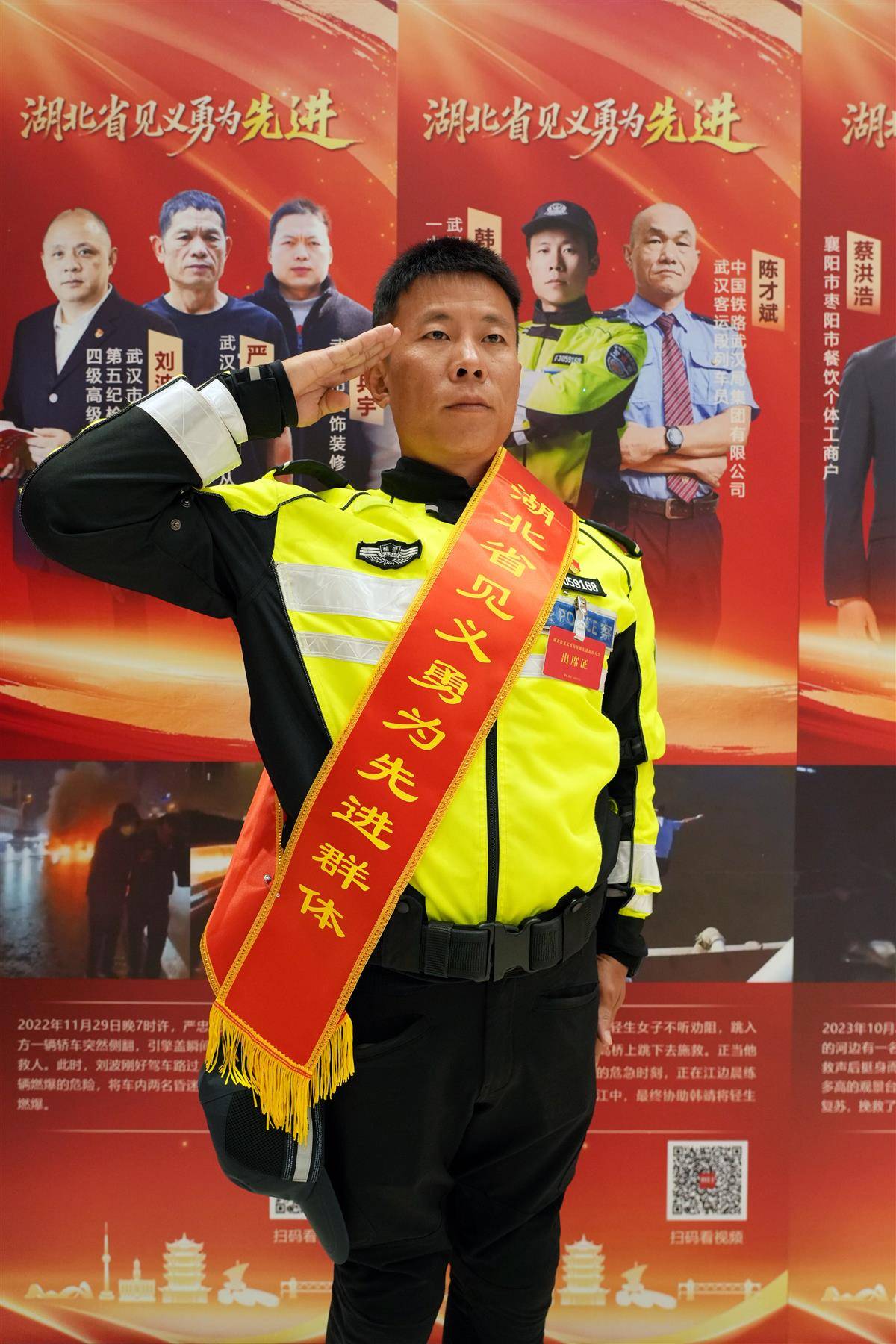 11月28日上午,湖北省见义勇为英雄先进表彰大会在武汉举行,24名见义勇为个人和15个群体获表彰。退役军人、武汉市公安局硚口区交通大队一中队辅警班长韩靖和武汉铁路局武汉客运段列车员、长江救援志愿队队员陈才斌光荣上榜,被授予“湖北省见义勇为先进群体”称号。