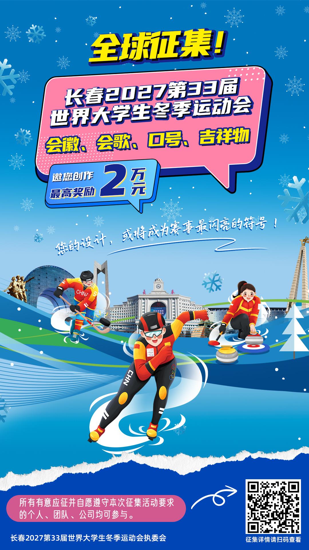 长春2027第33届世界大学生冬季运动会从11月28日起面向全球公开征集会徽、会歌、口号和吉祥物。
