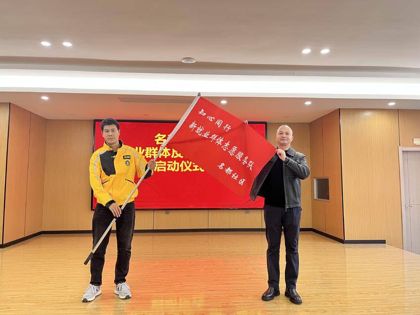 为充分激活这一基层治理“新动能”,名都社区主动牵头,正式组建“名都社区知心驿站——新就业群体志愿服务队”。仪式现场,名都社区党委书记杜柯手持队旗,郑重授予志愿服务队队长吴柯,鲜红的队旗迎风招展,标志着这支流动的“平安前哨”正式踏上反诈征程。