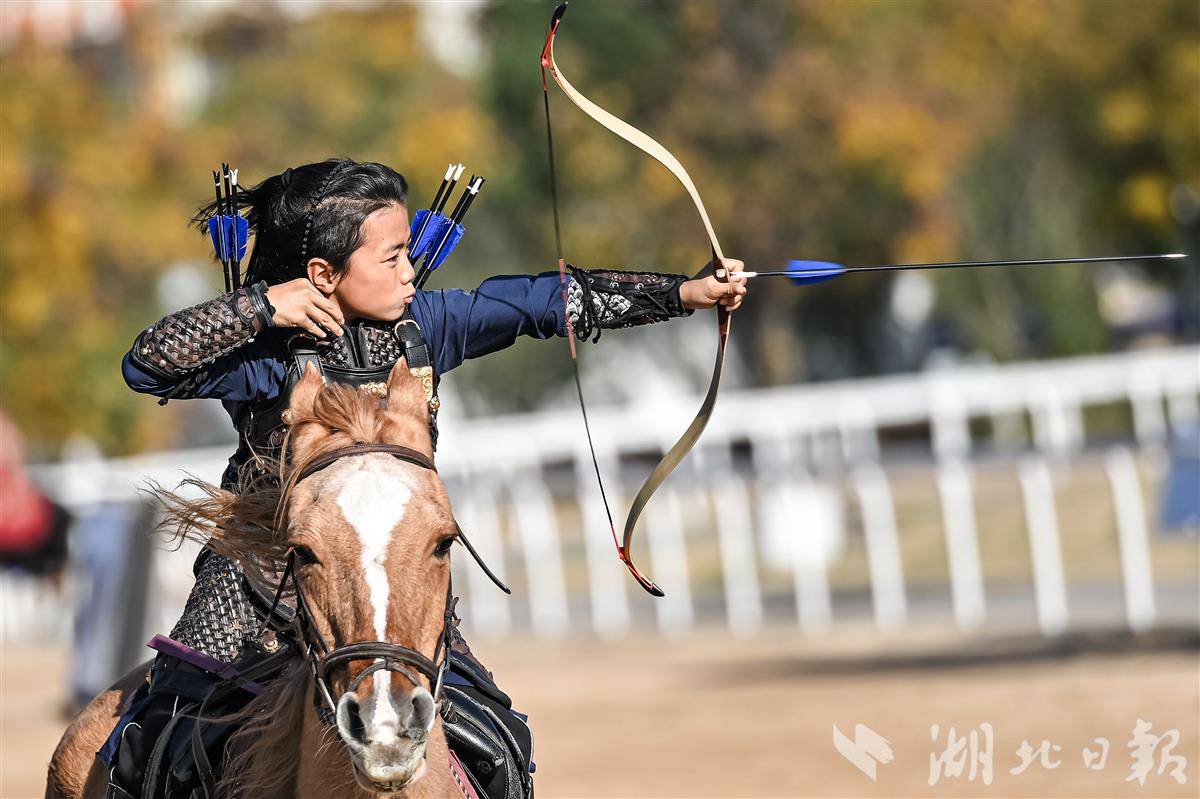 11月29日,一名小骑师表演跑马射箭。(湖北日报全媒记者 任勇 摄)