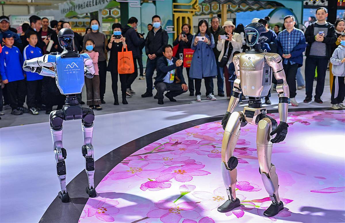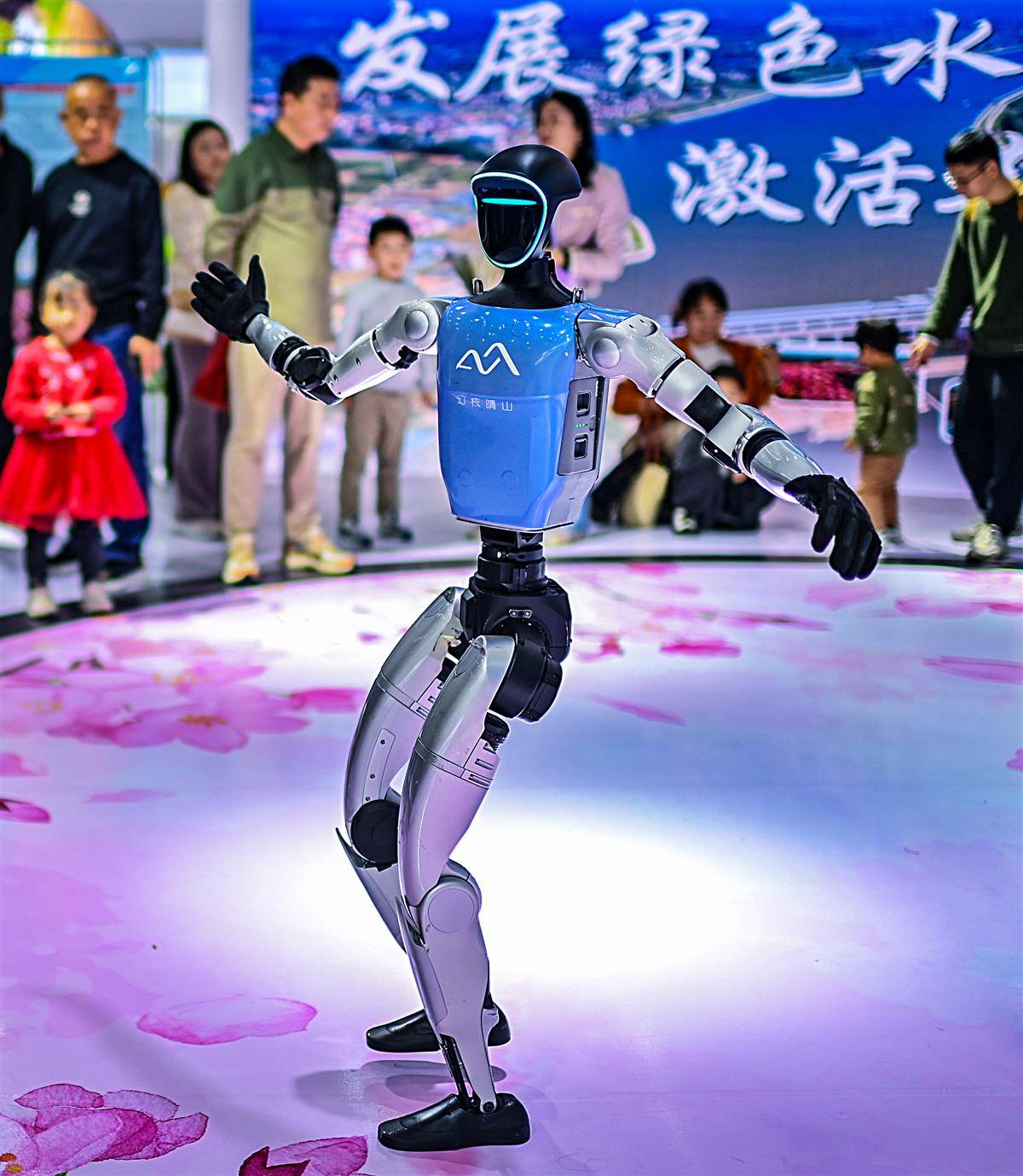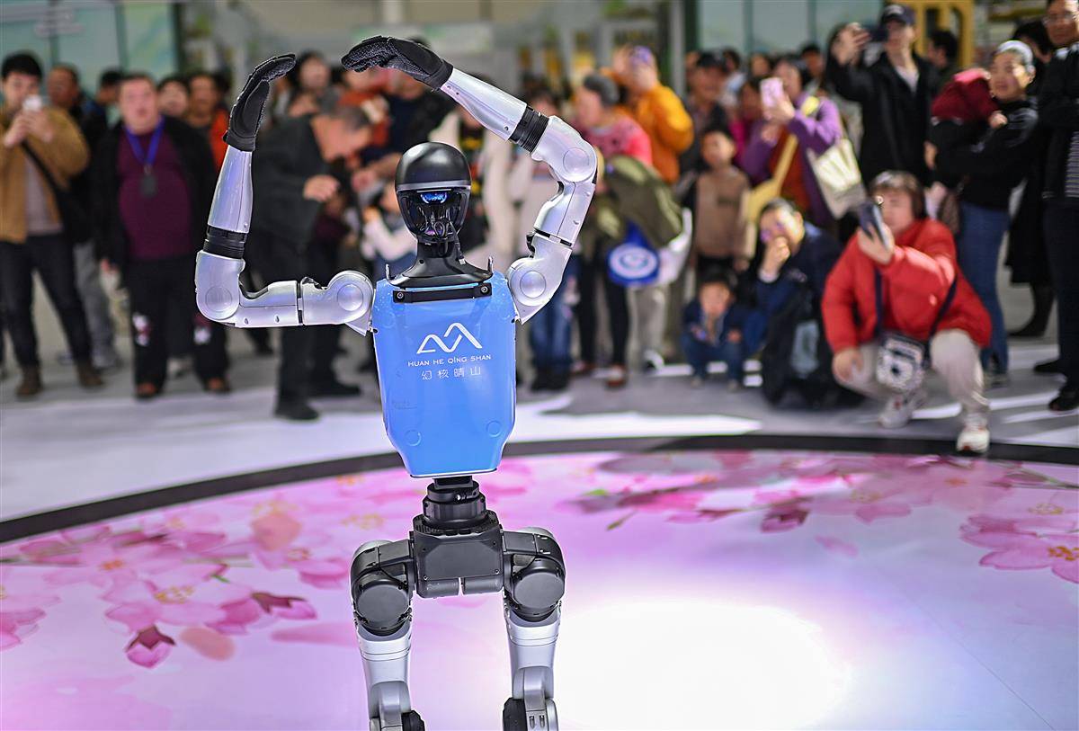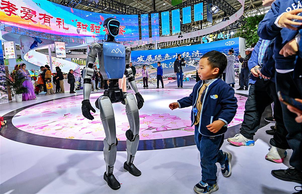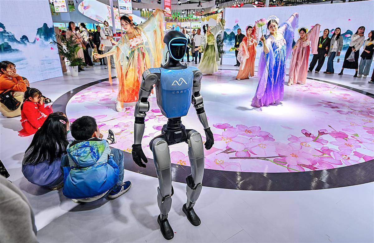 11月29日,在武汉国际博览中心(汉阳国博)举办的2025湖北农业博览会上,随州市的展区里正在举行品牌推介活动,两名人形机器人首先登台表演舞蹈,表演结束后,他们来到台下客串“保安”,维持现场秩序。(湖北日报全媒记者 朱熙勇 摄)