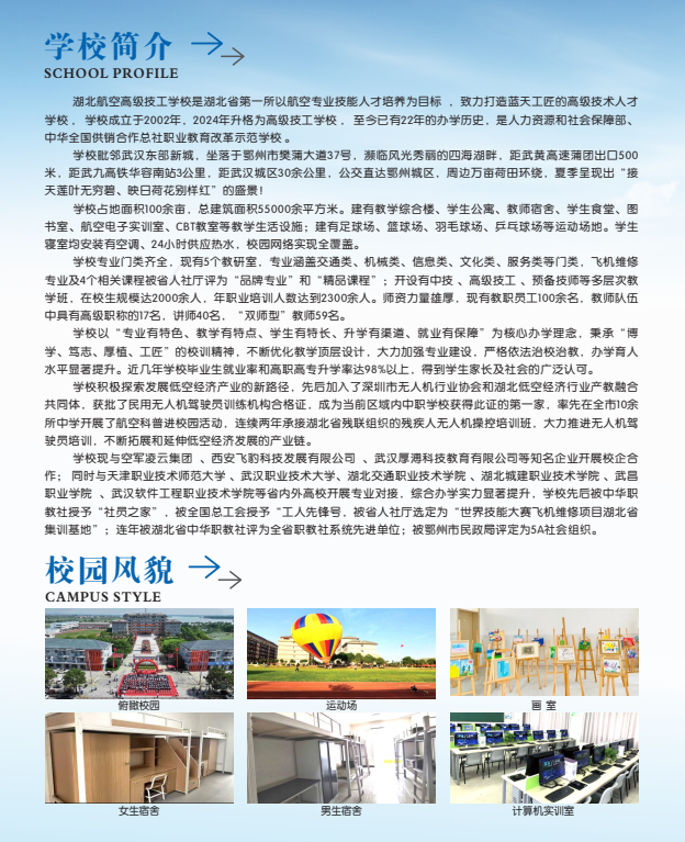 作为湖北省首家航空专业技能人才培养院校,湖北航校以40余年办学积淀铸就职教荣光,先后斩获中华全国总工会“工人先锋号”(全省职业院校唯一)等殊荣,超98%的升学率与就业率,更是被业内誉为低空经济人才培育的“黄埔军校”。