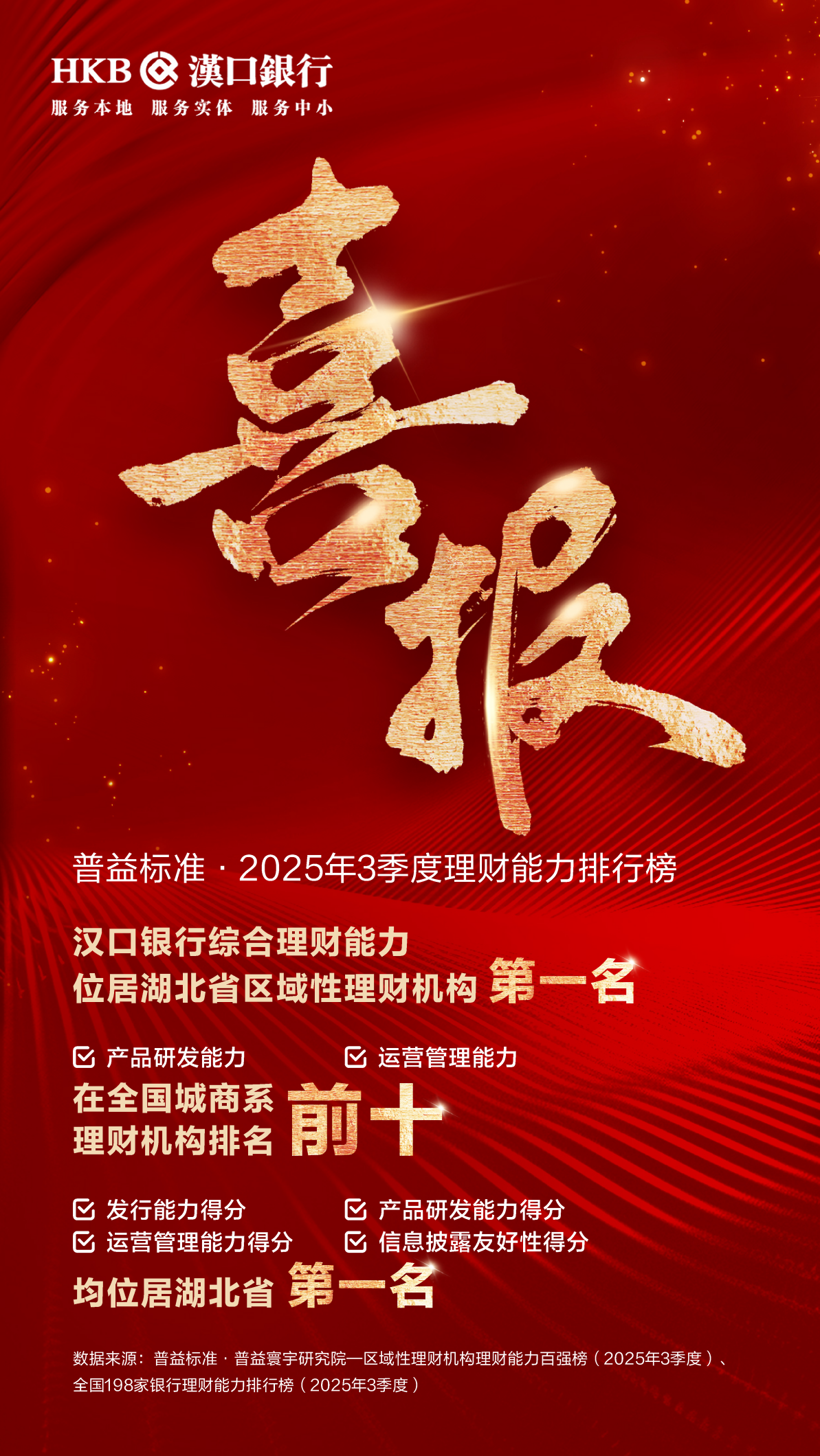 近日,国内权威第三方机构普益标准·普益寰宇研究院发布2025年3季度理财能力排行榜,汉口银行凭借全面均衡的综合实力脱颖而出,综合理财能力位居湖北省区域性理财机构第一名,多项指标领跑区域市场、跻身全国前十。
