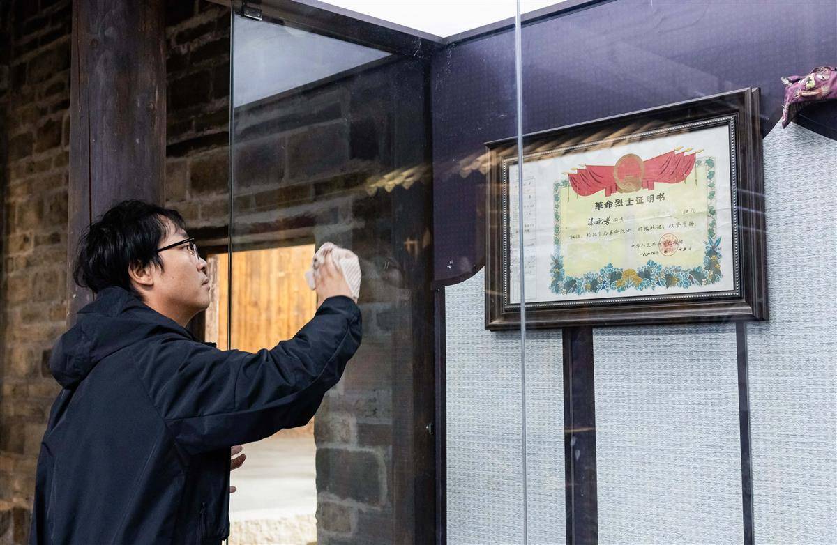 10月14日,漆黎明在大别山农耕民俗文化馆内擦拭橱窗,精心维护着太爷爷漆承芬的革命烈士证明书。(湖北日报全媒记者 薛婷 摄)