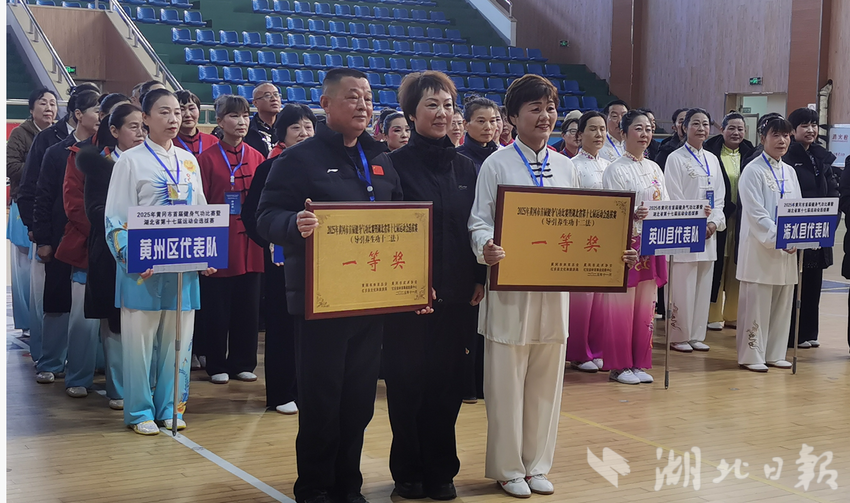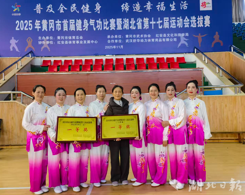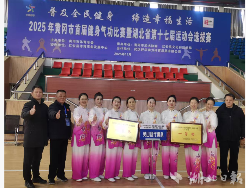 湖北日报讯(通讯员郑建军、童曙明)11月29日,2025年黄冈市首届健身气功比赛暨湖北省第十七届运动会选拔赛在将军故里红安县隆重举行。英山县武术协会受县文化和旅游局委派,首次组队参赛即表现卓越,一举夺得健身气功八段锦、导引养生十二法两项团体一等奖,并以总分第一的优异成绩实现“大满贯”,展现了英山武术运动的蓬勃活力。