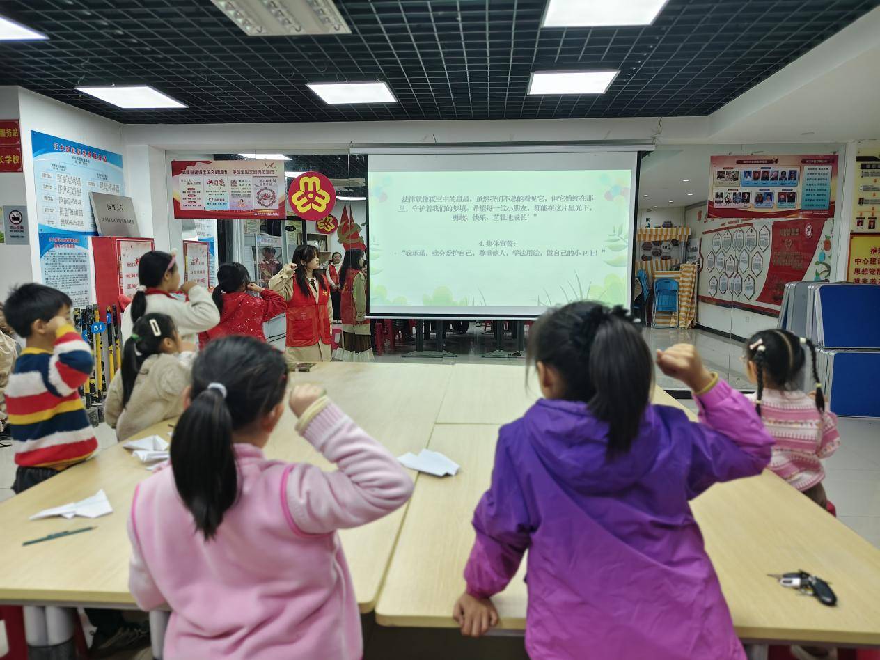 湖北日报讯(通讯员朱青)11月28日,武汉经开区沌阳街道江大园社区联合江汉大学法学院“普法轻骑兵”志愿服务队,以专业视角结合生动案例,让孩子们在互动体验中解锁“法律超能力”,为辖区小朋友们带来了一场趣味十足的普法小课堂。