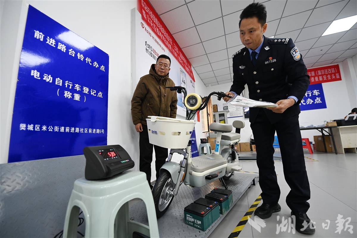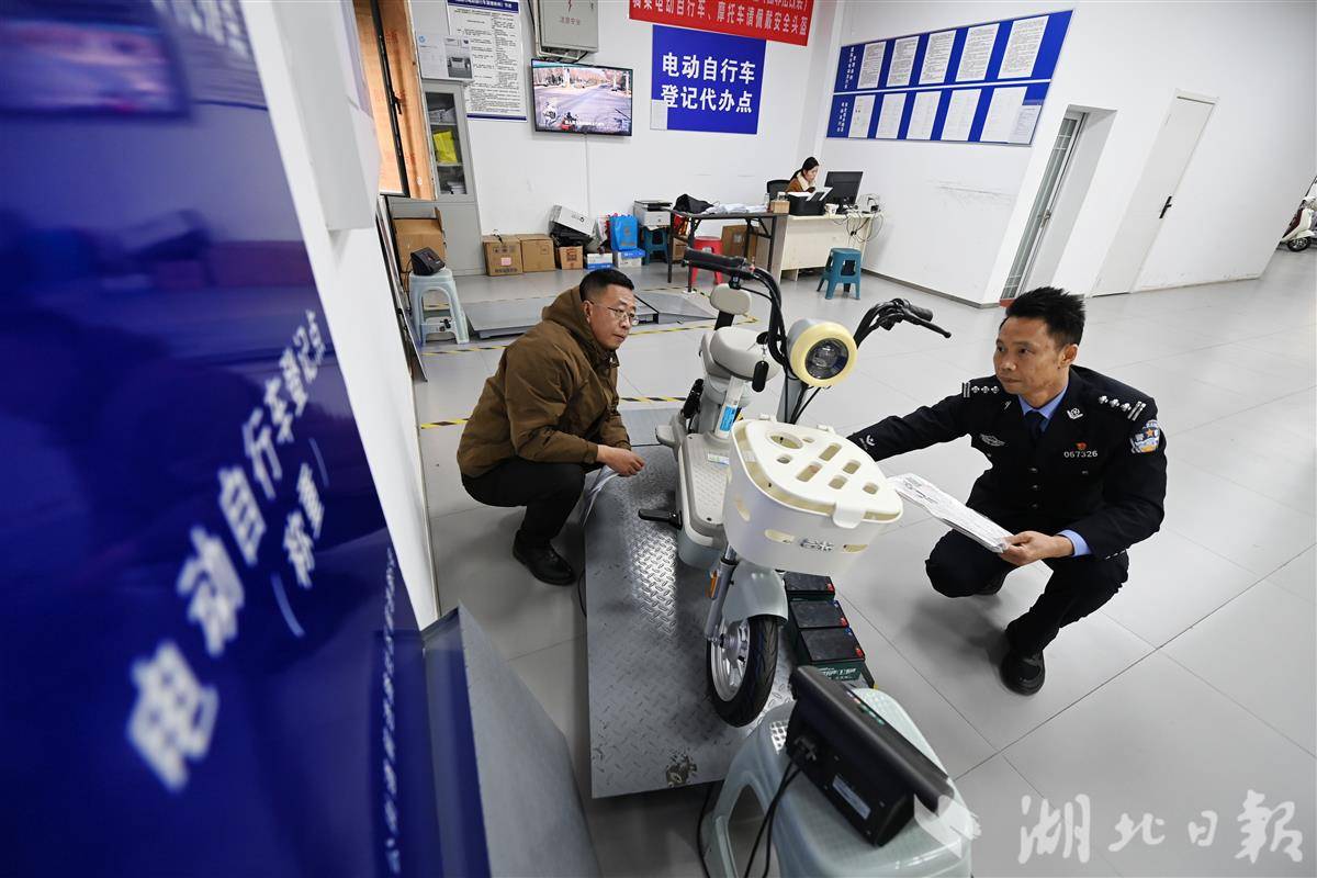 12月1日,襄阳市交警支队车管所民警按“新国标”流程查验电动自行车办理牌照。