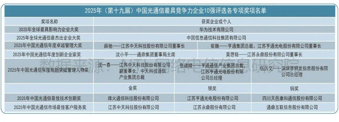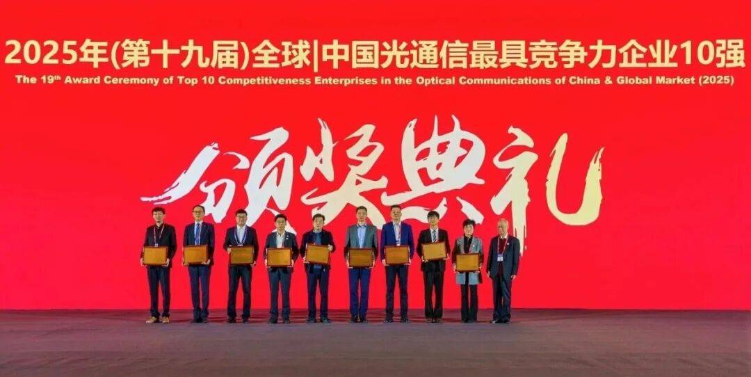 其中,中国信科获评“中国光通信最具综合竞争力企业10强”和“中国光通信市场最具品牌竞争力企业10强”,并斩获“2025年全球光通信最杰出企业大奖”。