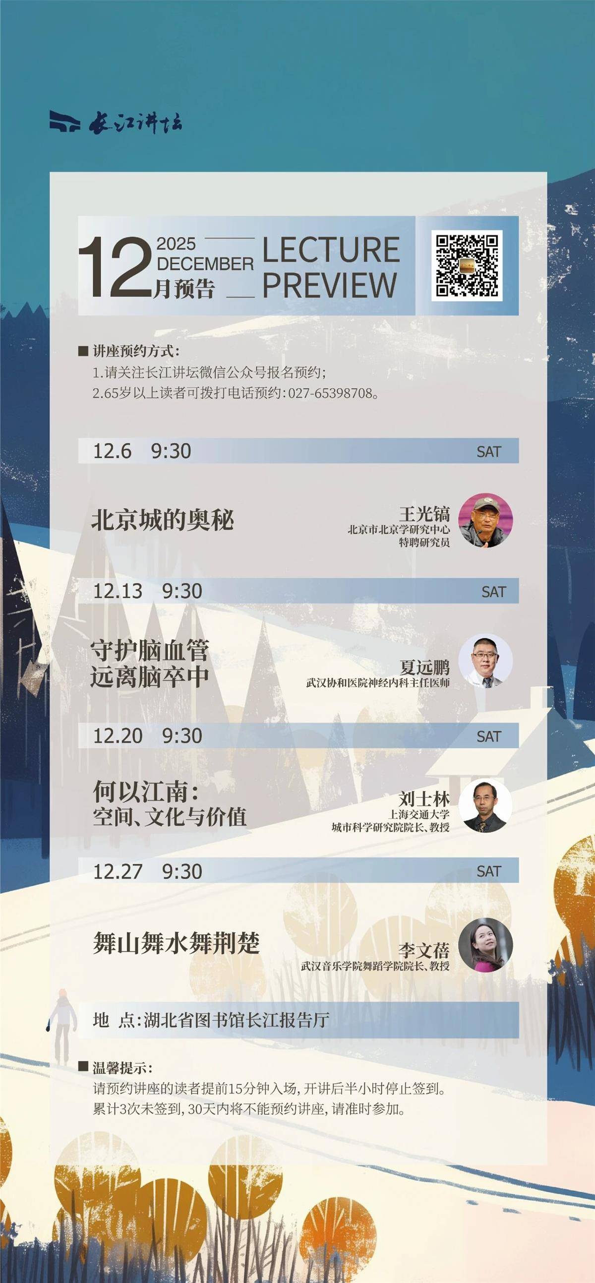 湖北日报讯 (记者王晶、通讯员谢宁)12月1日,湖北省图书馆发布12月长江讲坛预告,北京城的秘密、如何远离脑卒中、诗化江南的文化内涵、荆楚舞蹈的美学诉求,都在2025年最后一个月的长江讲坛上奉献给读者。