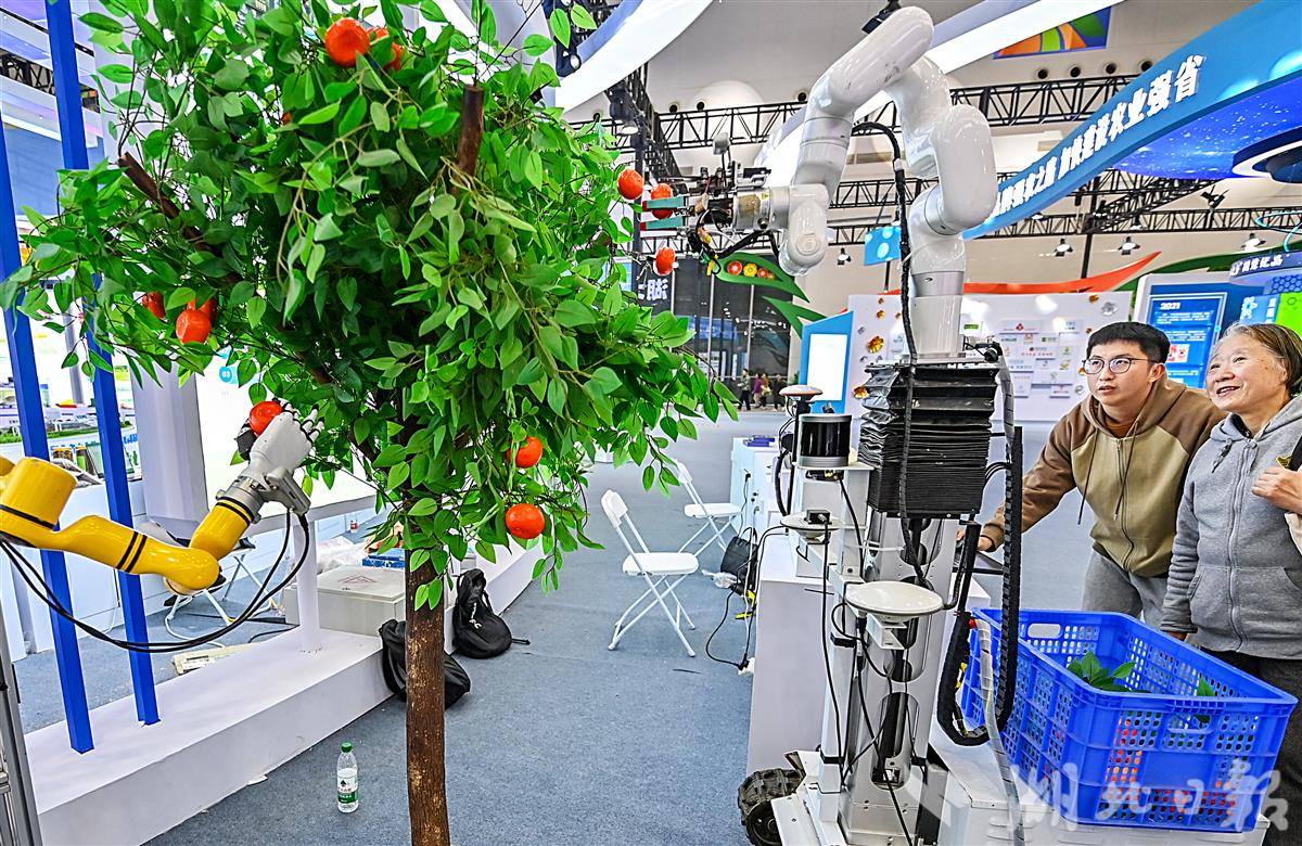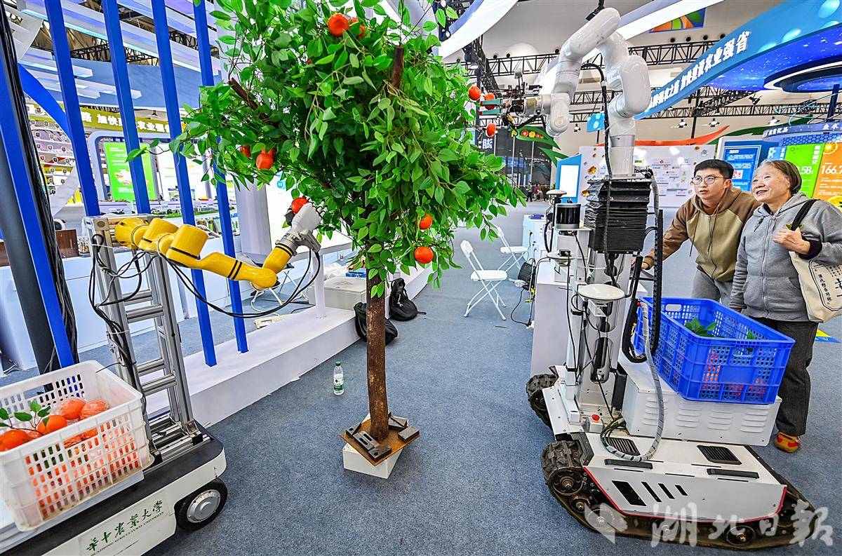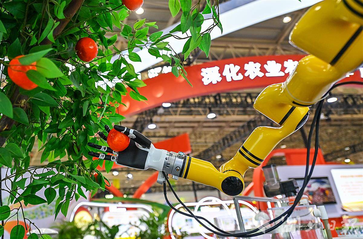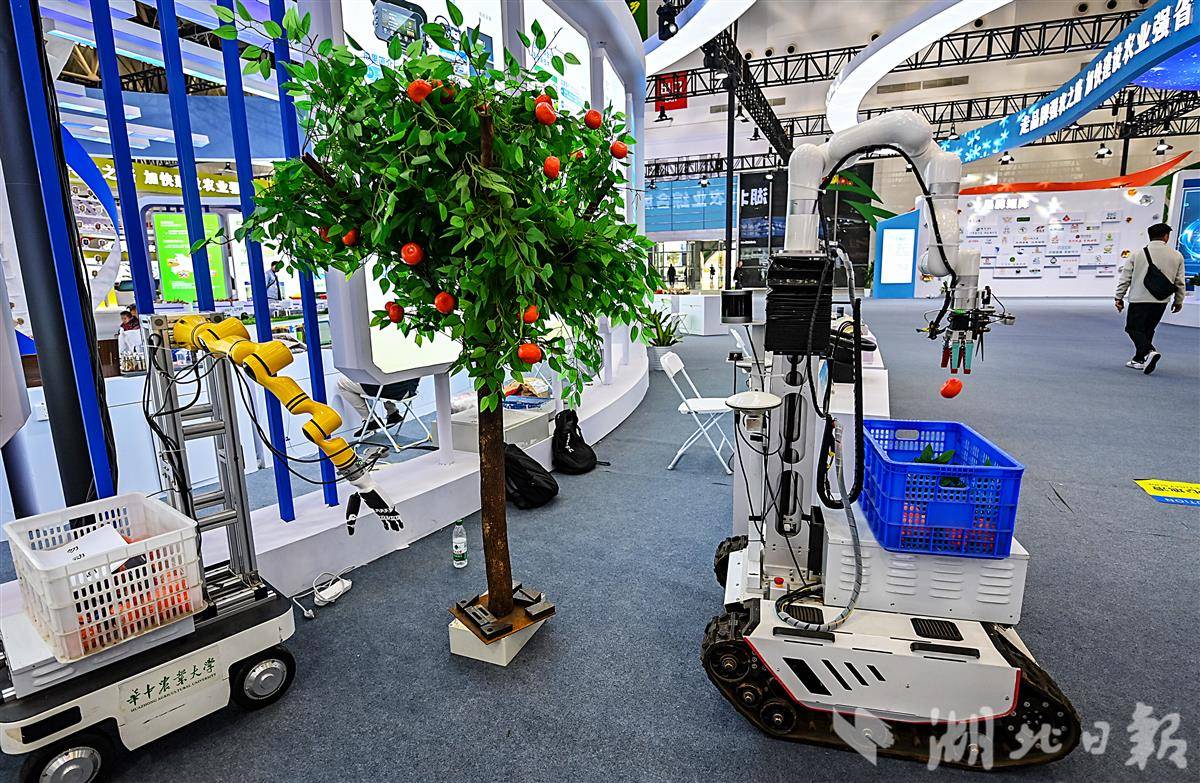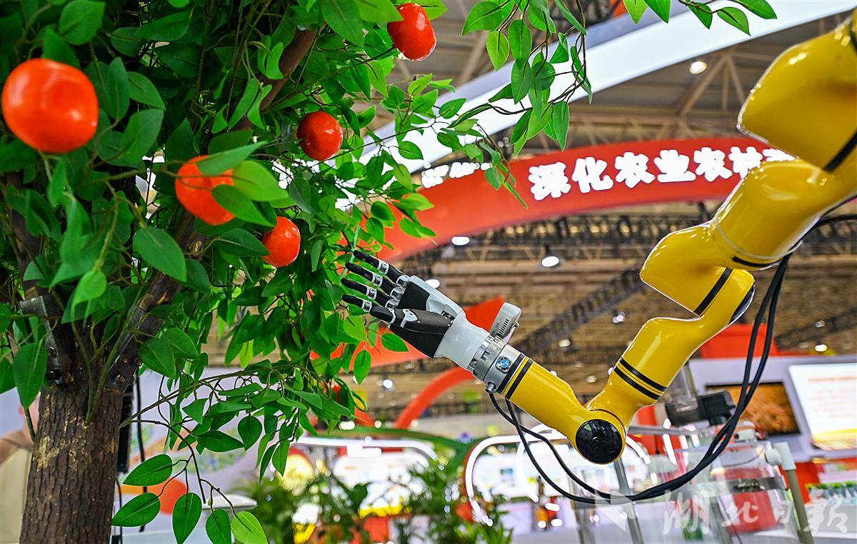 12月1日,在武汉国际博览中心(汉阳国博)举办的2025湖北农业博览会上,两台机器人的机械臂和灵巧手潇洒挥动,将果子握住、摘下,再放入筐里,快准狠,一气呵成。