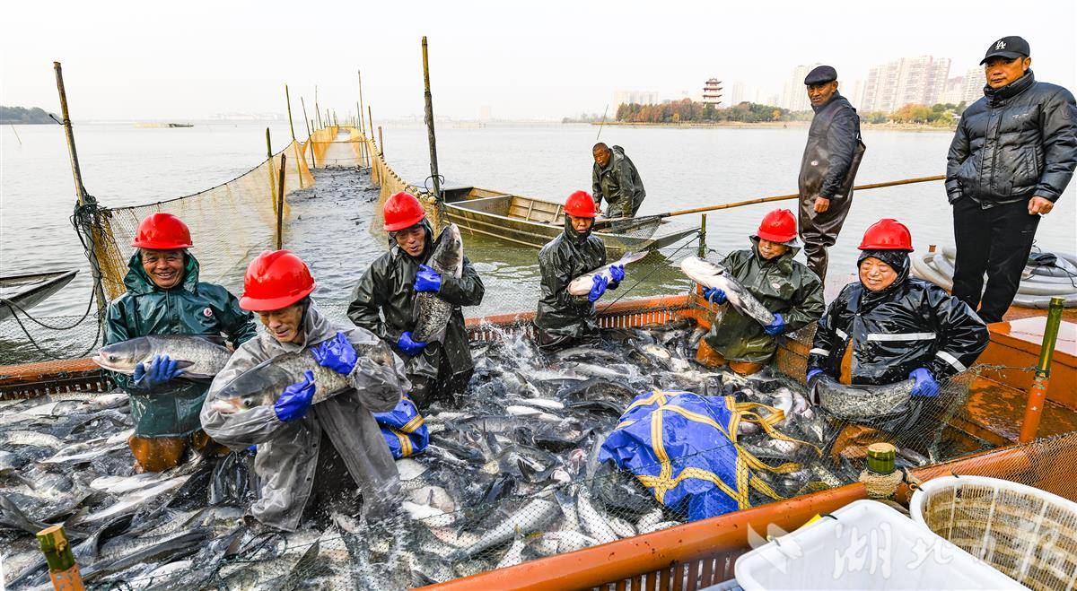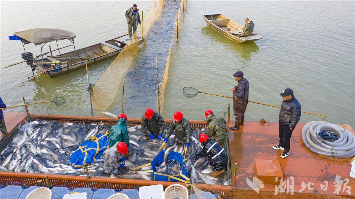12月2日,咸宁市嘉鱼县三湖连江梅懈湖,嘉鱼县南江水产有限责任公司正在进行赶网捕捞,工作人员熟练的起鱼、过磅、装车。