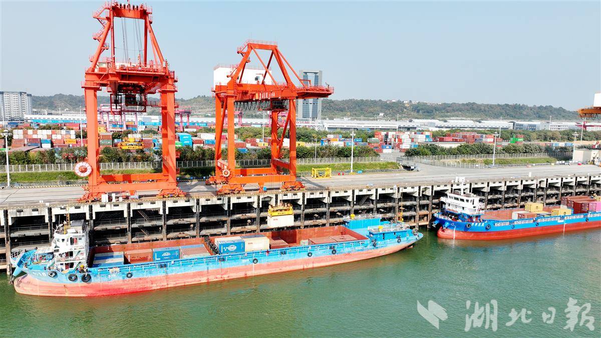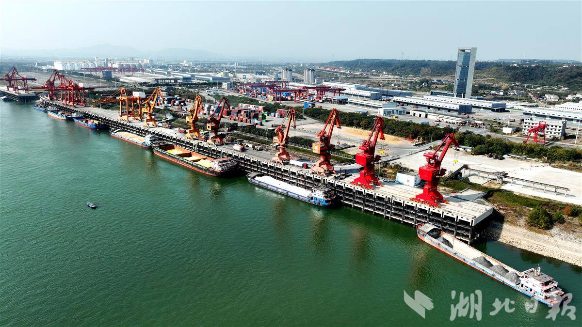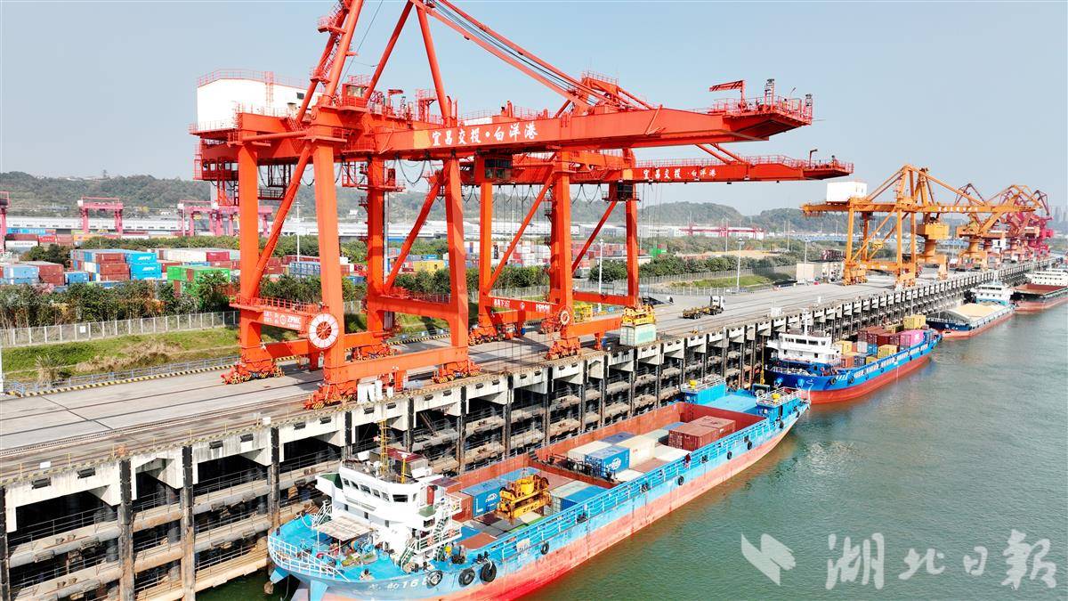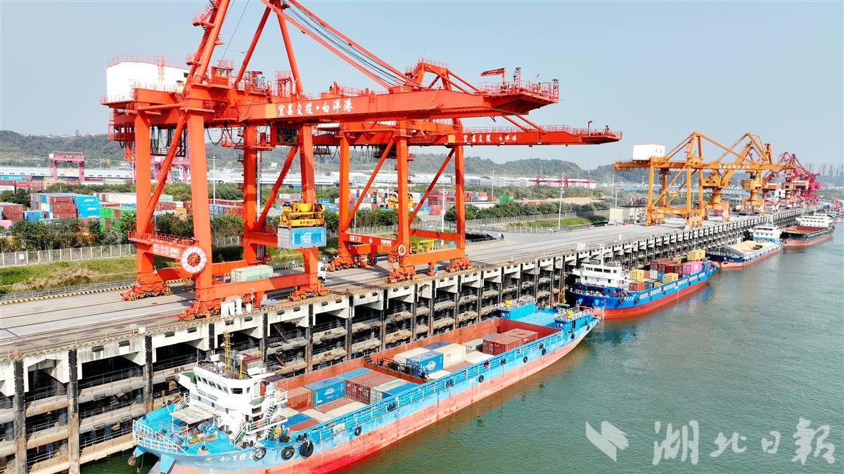12月1日,宜昌港务集团白洋港区运输车辆来往如梭,龙门吊振臂提送集装箱,货轮云集码头吞进吐出,呈现出冬日繁忙的景象。