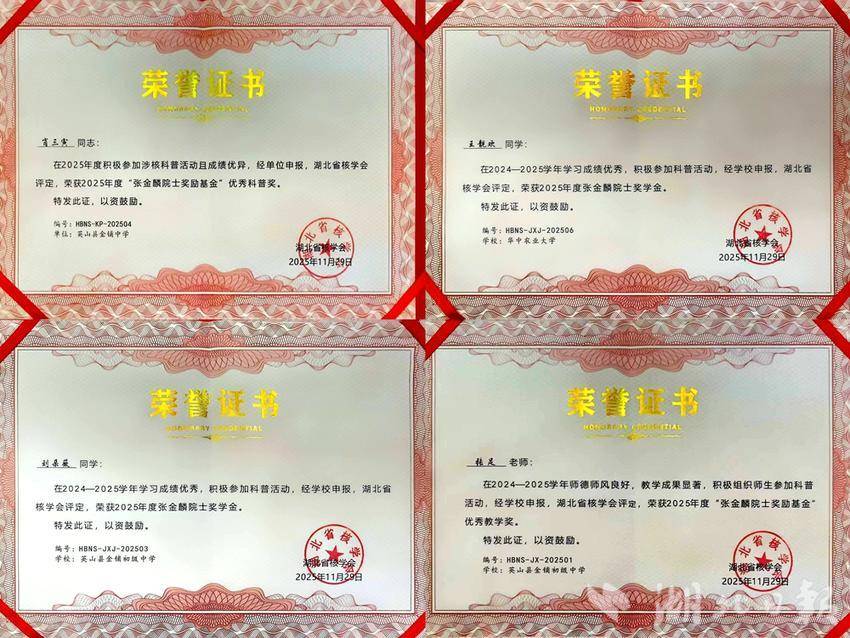 湖北日报讯(通讯员程良辉、张足、张云光、张云朝)11月29日,湖北省核学会第八届第二次理事会暨2025年工作会议在华中师范大学科学会堂隆重举行。省核学会常任理事单位——黄冈市英山县思源实验学校金铺校区师生代表赴汉参加会议,教师张足和3名学生获湖北省核学会嘉奖。