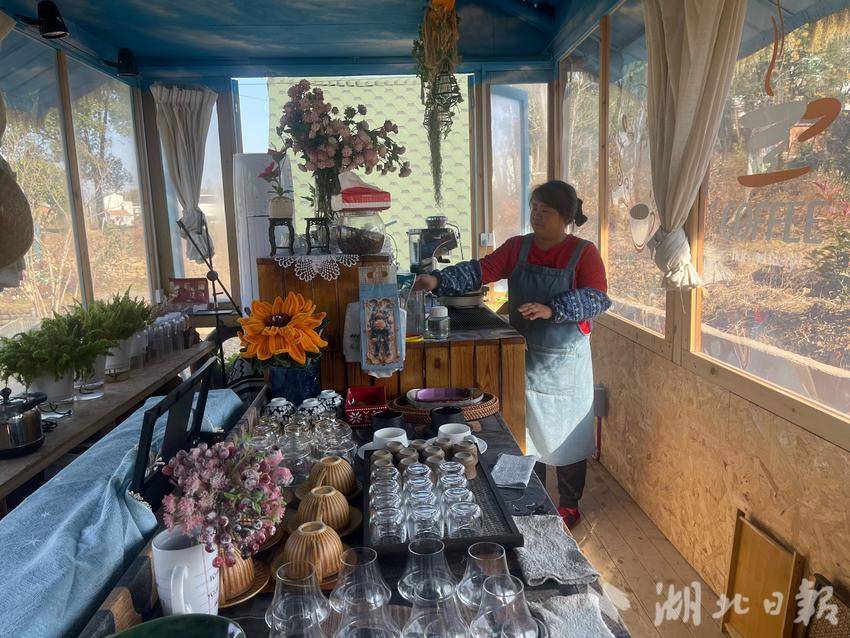 这片由麻城恒祺生态公司联合打造的农文旅综合体,藏着乡村振兴的巧思。稻田旁的咖啡屋飘出醇厚香气,老农户洪大叔正带着游客体验脱粒农活,笑着说:“以前守着田地靠天吃饭,现在在家门口就能当‘服务员’,每月有钱挣还能陪家人,日子比咖啡还甜!”