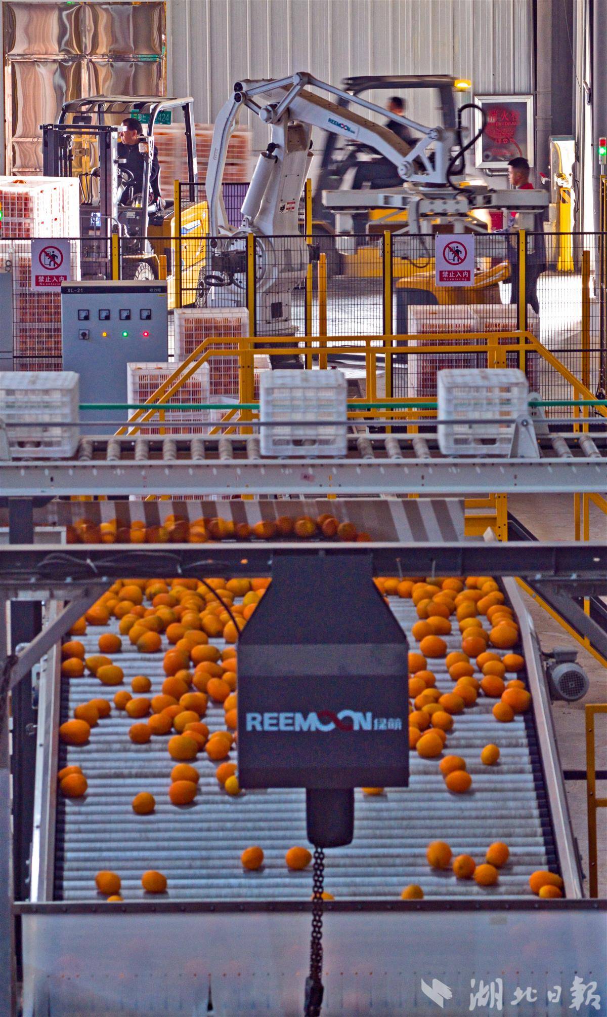 12月1日,宜都市高坝洲镇,湖北品冠农业科技发展有限公司的智能分选线正全速运转。脐橙与蜜柑在流水线上快速流转,设备依据果实的重量、颜色、瑕疵与糖度等多重指标,自动完成分级筛选与装箱。这批30吨的优质果品,经精准分选后即将发往俄罗斯。