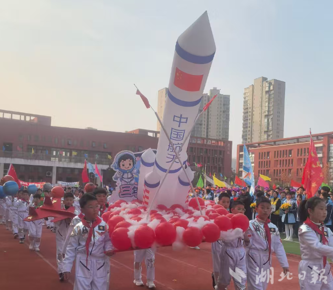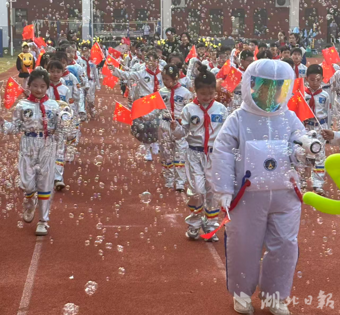 开幕式现场,气氛热烈而庄重。当师生们围绕“科技主题”组成的创意方阵出场时,全场观众的目光瞬间被吸引。有的方阵以浩瀚星空为主题,同学们头戴自制的星空帽,手持道具,仿佛在探索神秘的太空世界;有的方阵以中国天宫空间站为灵感,身着白色宇航服,迈着坚定的步伐,展现了中国航天的宏伟气势;还有的方阵以“神舟系列飞船”为元素,手持精心制作的各类航天器、火箭等手工品,展示了中国科技的强大实力。这些创意方阵不仅展示了同学们的创造力和想象力,也让大家感受到了科技的魅力。