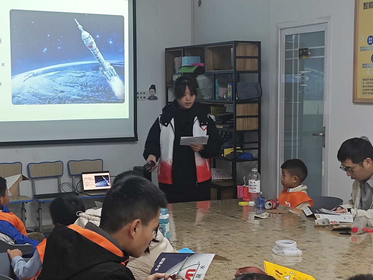 紧接着,晴川学院志愿者开启航天理论科普环节。志愿者王佳驻以“什么是导弹?火箭和导弹有什么区别?”为切入点,借助生动的PPT动画和通俗比喻,为孩子们揭开“国之重器”的神秘面纱,将火箭反作用力飞行原理、导弹制导系统与控制系统等复杂知识转化为趣味小故事。孩子们听得聚精会神,互动问答环节踊跃举手,尽显对航天知识的浓厚兴趣。
