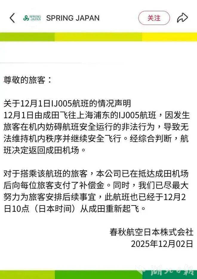 12月2日,春秋航空日本株式会社(Spring Japan)发布关于12月1日IJ005航班的情况声明:12月1日由成田飞往上海浦东的IJ005航班,因发生旅客在机内妨碍航班安全运行的非法行为,导致无法维持机内秩序并继续安全飞行。经综合判断,航班决定返回成田机场。