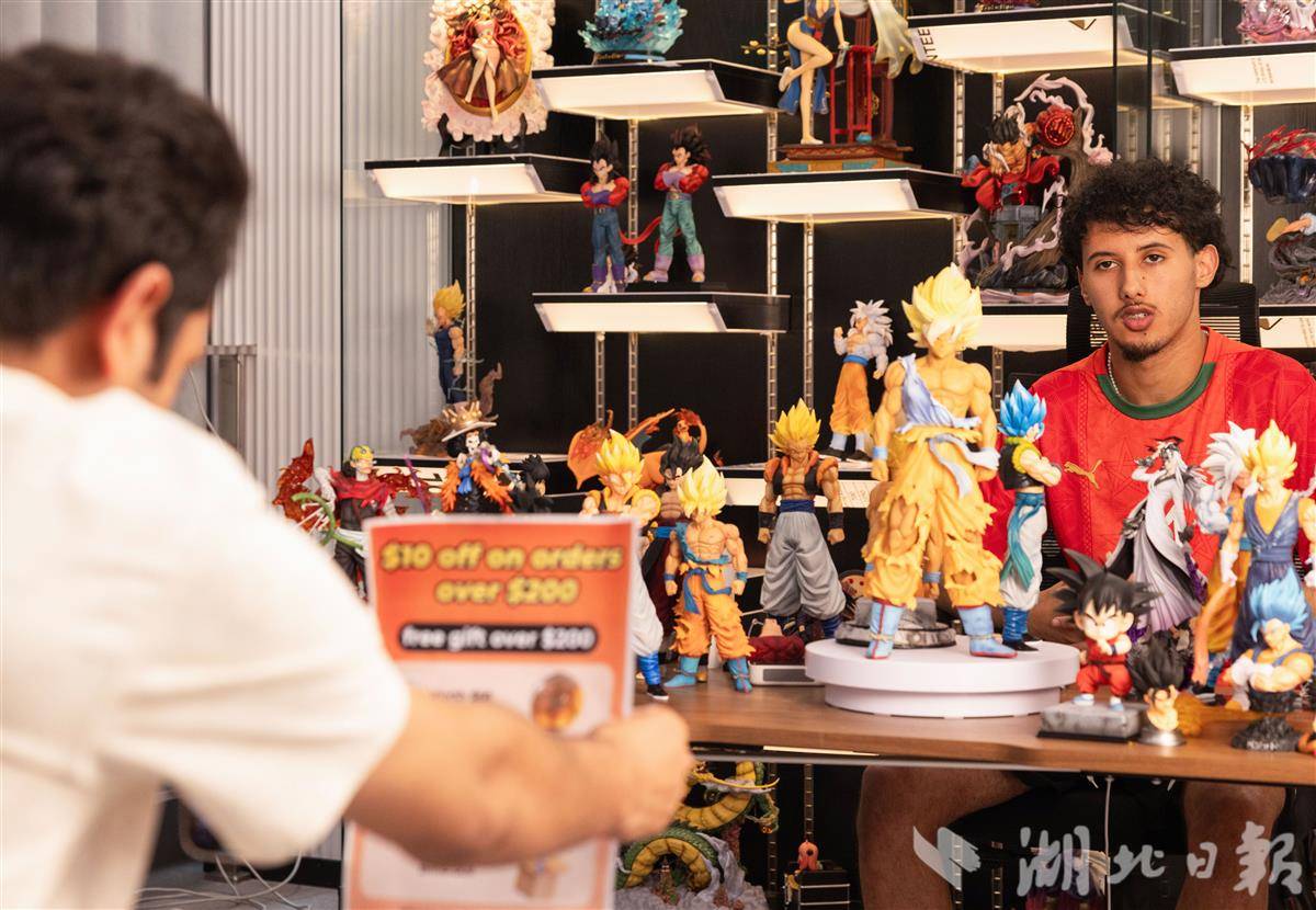 鄂州跨境电商产业园,来自巴基斯坦、摩洛哥的主播们在TikTok直播间向美国粉丝推介Costplay手办。
