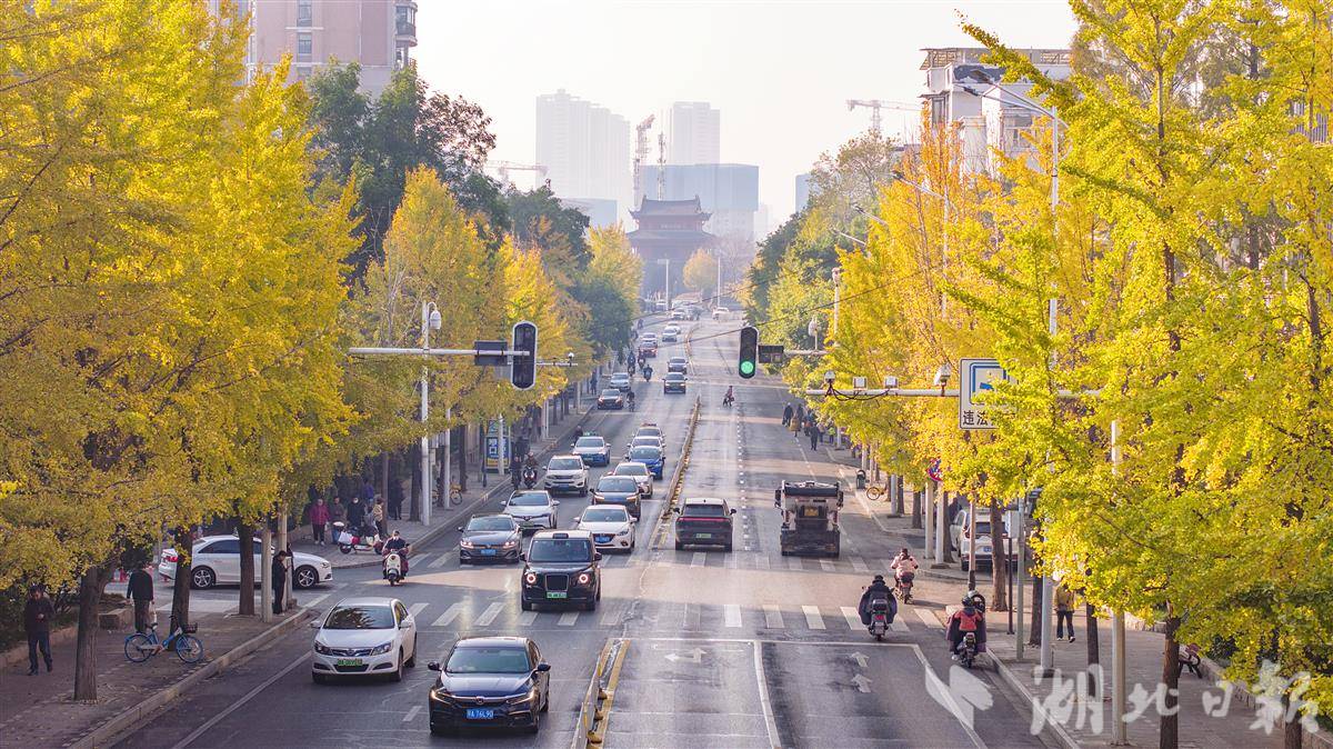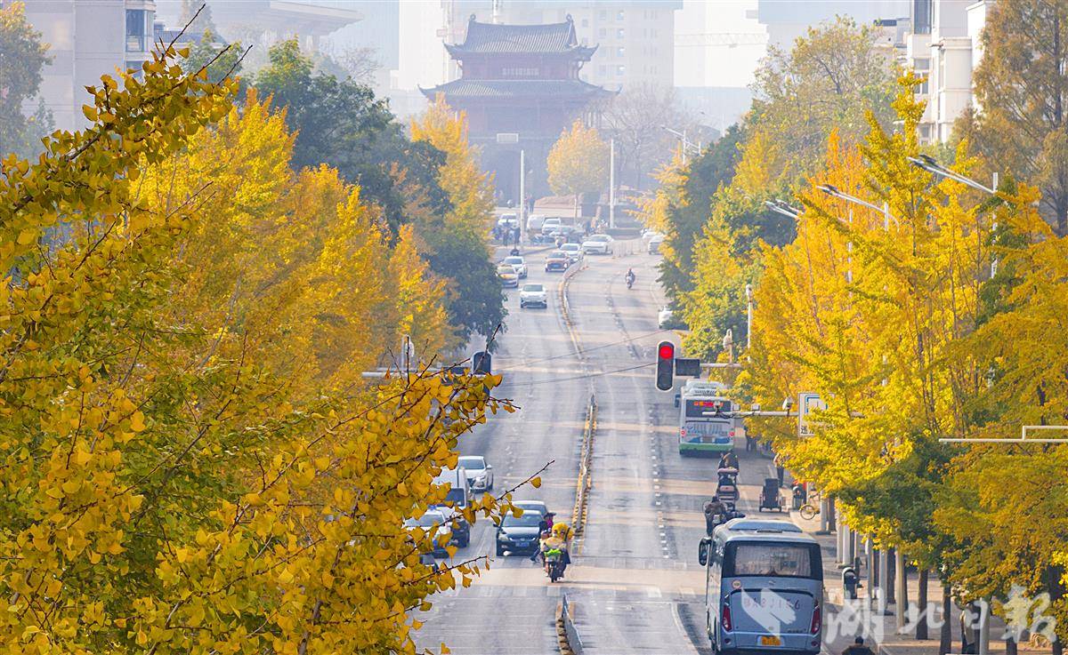 近日,武汉武昌首义路上的银杏叶黄了,一派迷人秋色。从张之洞路到起义门1.2公里的首义路两侧,种植着数百株银杏树,每年的初冬时节,该路便换上金色盛装,吸引了络绎不绝的市民游客驻足欣赏,以起义门和满街银杏黄为背景镜头定格。(湖北日报全媒记者 朱熙勇 摄)