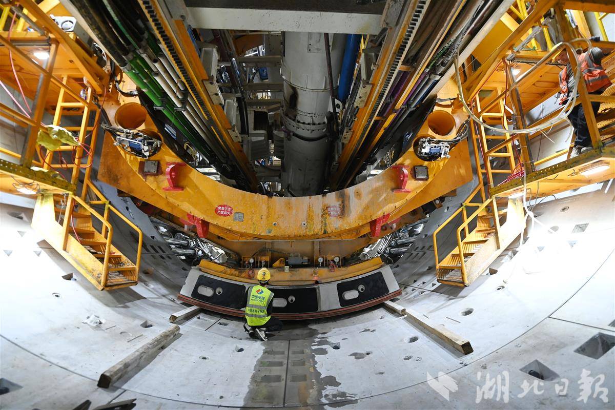12月3日,在襄阳市谷城县五山镇的引江补汉工程输水隧洞,工人在掘进机内安装管片。