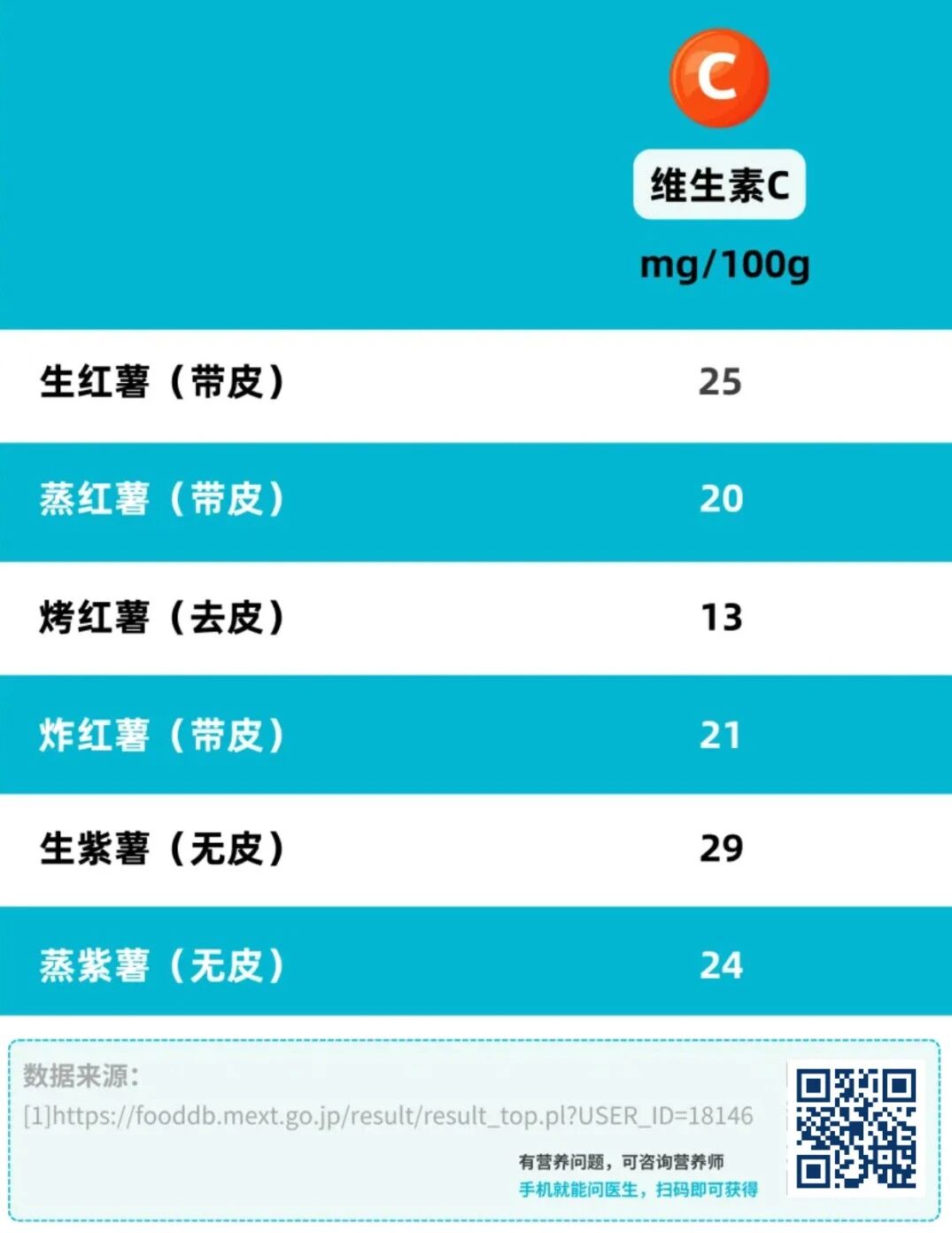 不同颜色的甘薯都含有丰富的维生素C,在日本的成分表中,紫薯的维生素C含量高达29mg/100g,比柠檬的22mg/100g还高。