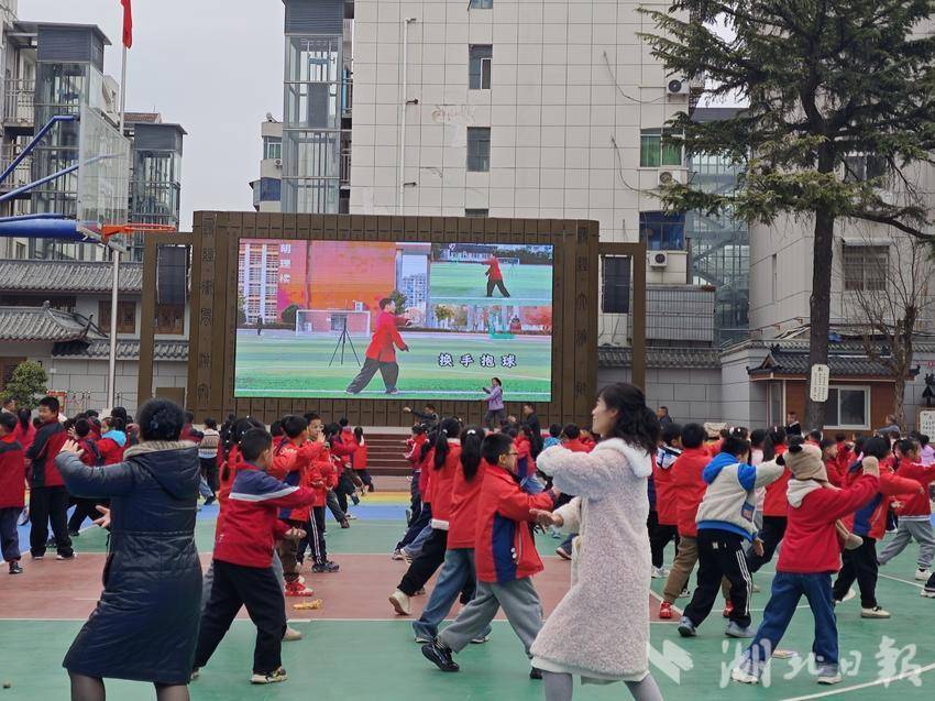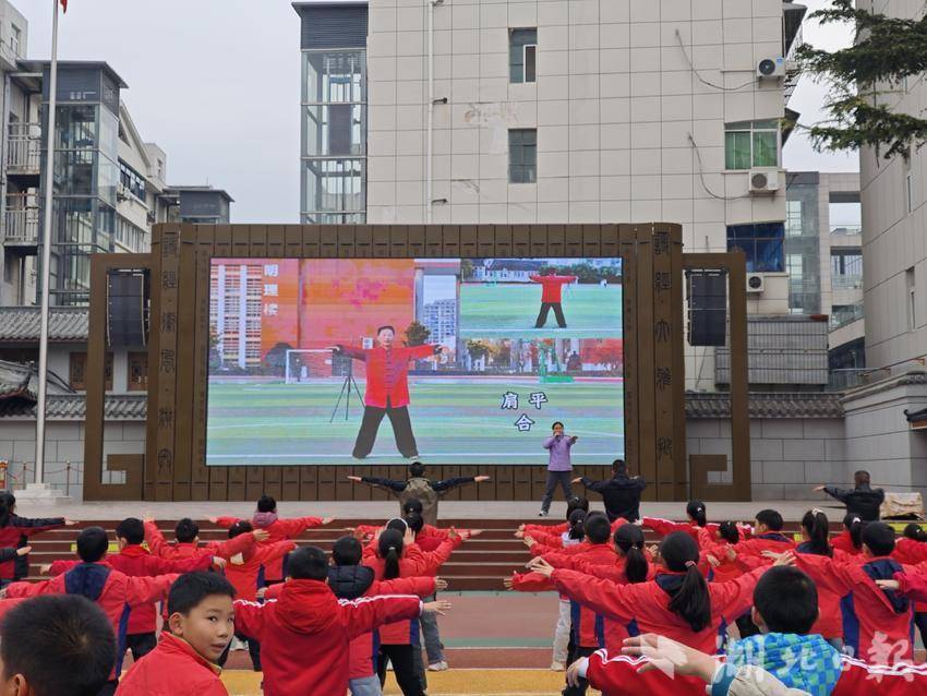活动过程中,实验小学升旗台大屏上清晰展示着太极动作分解,领练老师也边示范边讲解“左上右下”等动作要领,学生们身着统一校服,挺胸、抬手、转体,动作虽稚嫩却专注认真;不少教师也加入队列,与学生同练同悟,操场上整齐的动作与舒展的身姿,成了校园里一道独特的风景线。