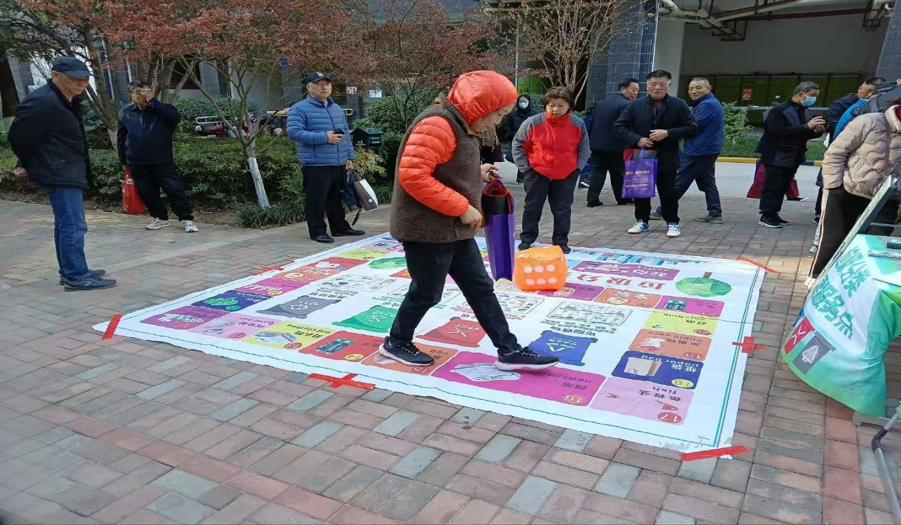 活动现场,社区工作人员精心设计“垃圾分类地图”“垃圾卡入箱挑战”等互动游戏。在戎安华府小区广场,居民王婆婆掷出骰子后,根据点数对应迈步,当停在“过期药品”标识处时,她稍作思索便将对应的模拟垃圾投入“有害垃圾”桶。“平时总搞不清药品属于哪类,今天通过游戏记牢了!”王婆婆笑着说道。星荟城商场门口的“垃圾卡入箱”区域同样热闹,参与者需将印有垃圾名称的卡片精准投入对应颜色的垃圾桶,社区志愿者在现场及时纠正错误投放行为,并为参与者发放印有分类指南的环保袋作为奖励。